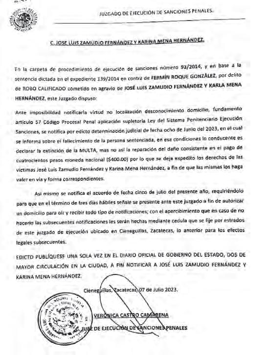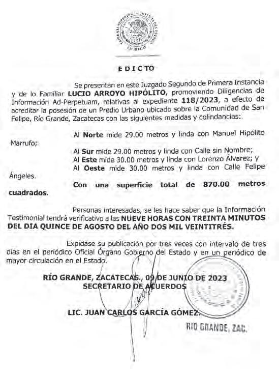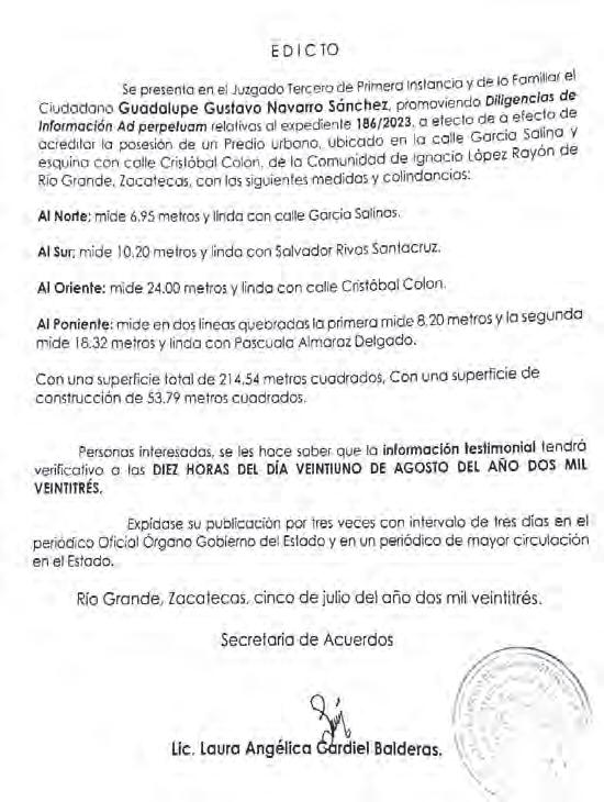 23 de julio de 2023 Zacatecas, Zac. Número 5235 $15.00 FRESNILLO 94.3 FM RÍO GRANDE SOMBRERETE 92.3 FM / TLALTENANGO 90.1 FM Y 1100 AM / CONCEPCIÓN DEL ORO 101.3 FM / PINOS 102.5 FM www.ntrzacatecas.com