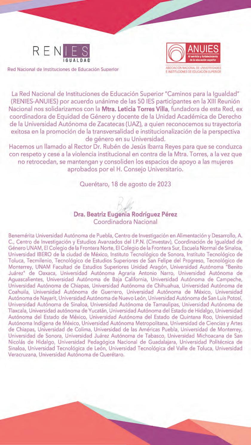 En el estado, la Red se conforma por la Coordinación Feminista Olimpia De Gouges, la Universidad Autónoma de Zacatecas (UAZ), Poiesis, así como Zacatecanas y Zacatecanos por la Paz, quienes trabajaran bajo tres ejes: vigilancia, propuesta e incidencia.