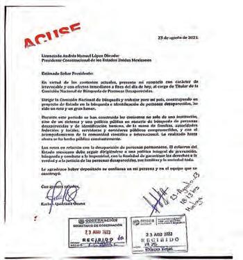 Karla Quintana Osuna anunció su renuncia a la Comisión Nacional de Búsqueda de Personas en México este miércoles, según informó en sus redes sociales. A través de una carta al presidente Andrés Manuel López Obrador, la doctora en Derecho por la Universidad Nacional Autónoma de México (UNAM), activista y feminista, presentó su renuncia y agradeció al mandatario la confianza para desempeñar su cargo en la división de la Secretaría de Gobernación.