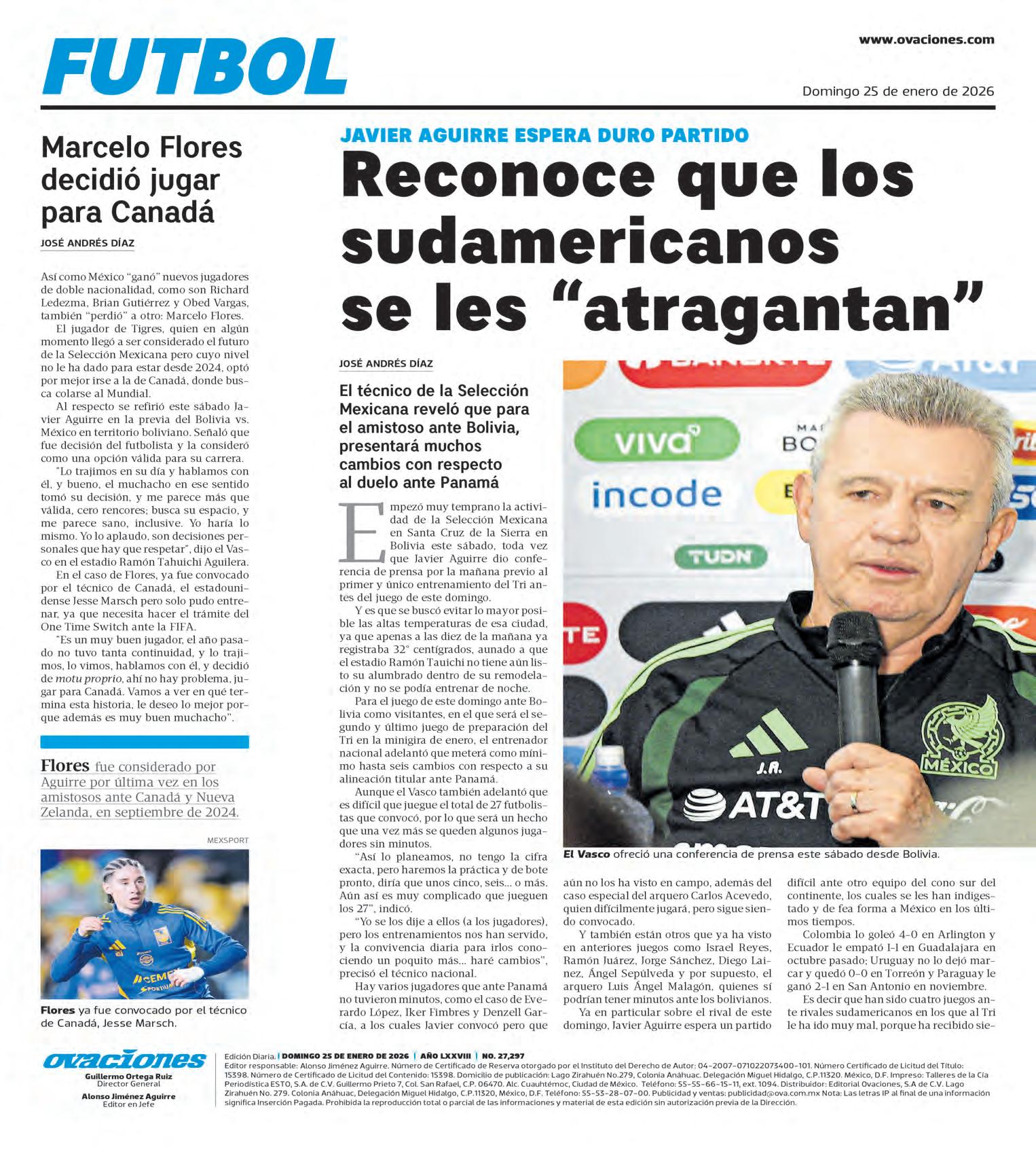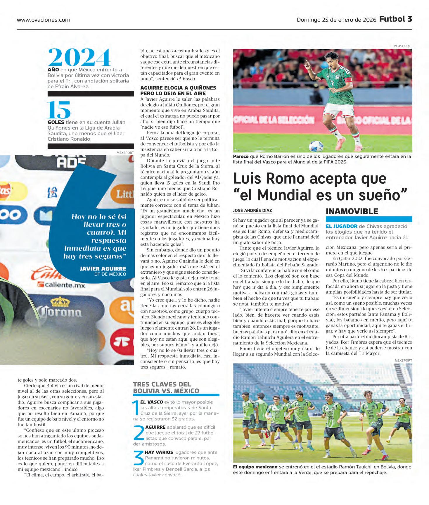 ● LA SELECCIÓN Mexicana disputará hoy a las 13:30 horas, su segundo partido de 2026 el cual será de visita ante Bolivia en el estadio Ramón Tahuichi en la ciudad Santa Cruz de la Sierra. OVACIONES O4