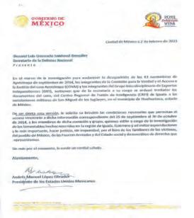 El presidente Andrés Manuel López Obrador transparentó un nuevo informe en torno al caso de los 43 estudiantes desaparecidos de Ayotzinapa, el cual –informó– rechazaron recibir los padres. El documento, de 34 páginas, establece tres causales de la desaparición de los jóvenes: confusión de la banda de Guerreros Unidos con presuntos infiltrados de Los Rojos entre el grupo de estudiantes. Un escarmiento a los jóvenes por amenazas de parte del entonces alcalde José Luis Abarca tras protestas de éstos, y el trasiego de droga en uno de los autobuses tomados. EL FINANCIERO F13