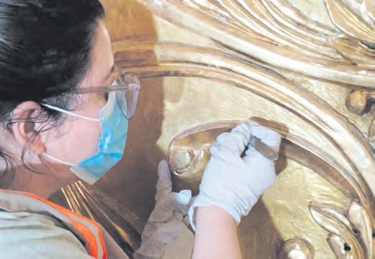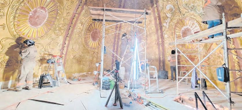 ●GUADALUPE. Un grupo de especialistas del Instituto Nacional de Antropología e Historia (INAH) Zacatecas restaura la cúpula de la emblemática Capilla de Nápoles. Se trata de un proceso para recuperar el brillo de las hojas de oro, las molduras y la pintura dañada a causa de las filtraciones de agua. TEXTO Y FOTOS: ESAÍ RAMOS CULTURA A12