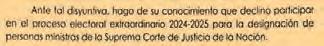 Moreleón, magistrado del Primer Tribunal Colegiado del Vigésimo Tercer Circuito en Zacatecas, declinó su candidatura para participar en el proceso electoral extraordinario 2024-2025 para la elección de magistrado de circuito, como marca la reforma al Poder Judicial de la Federación (PJF). Luego de ser seleccionado en la