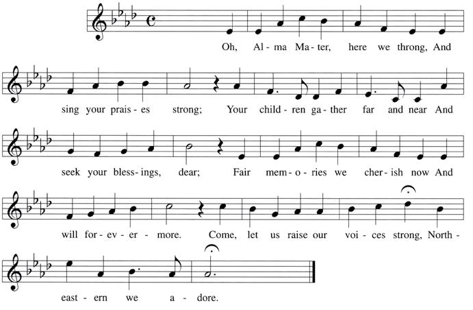 Come, let us raise our voices strong, Northeastern, we adore.