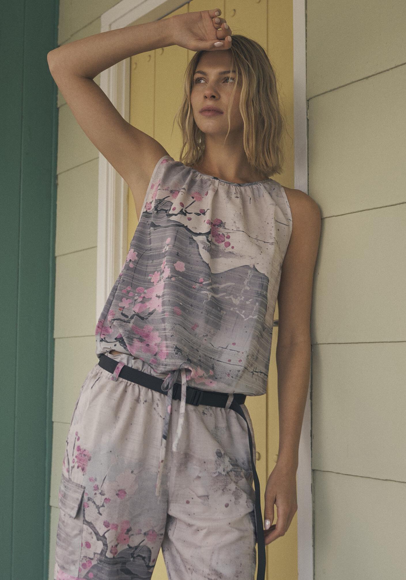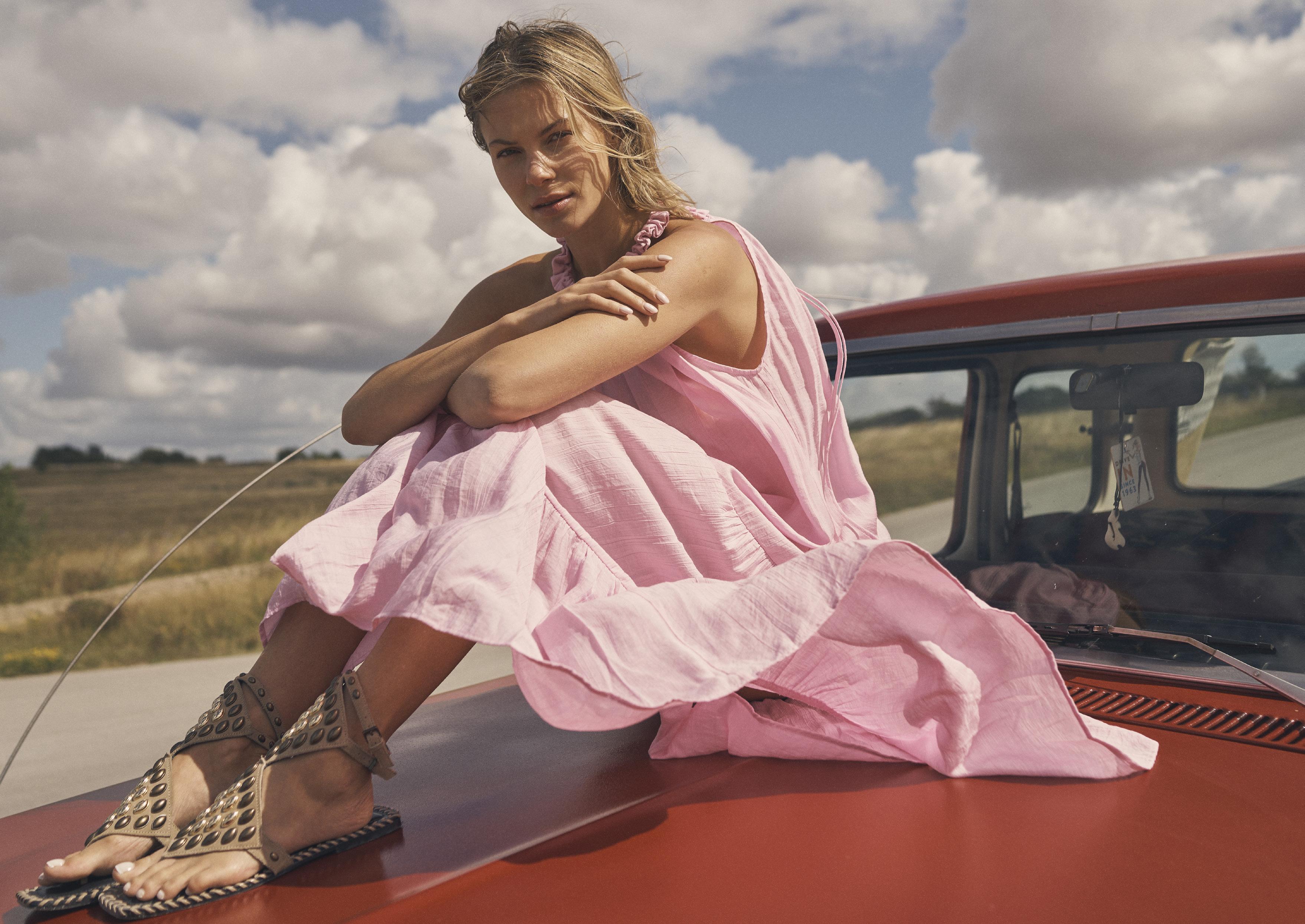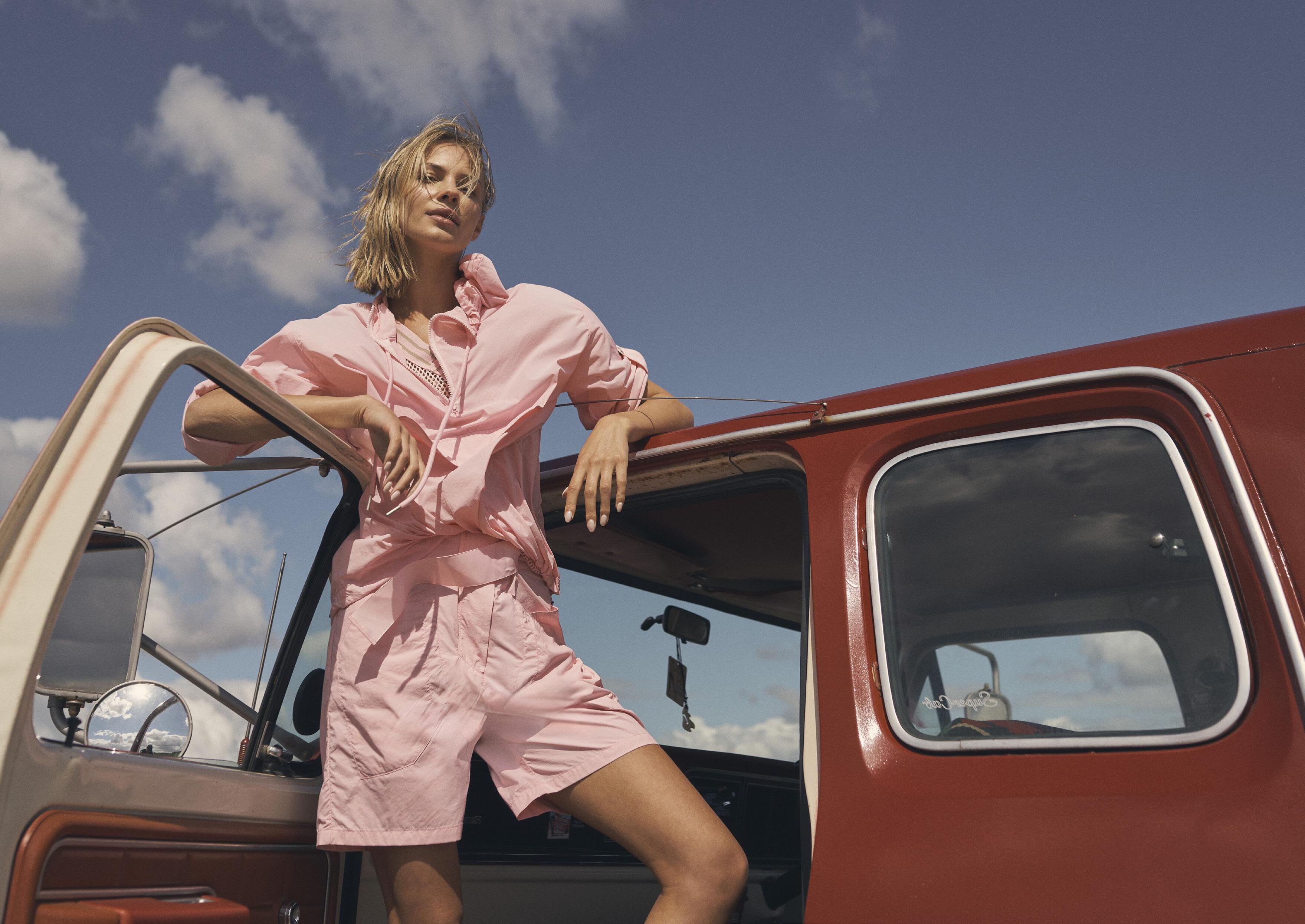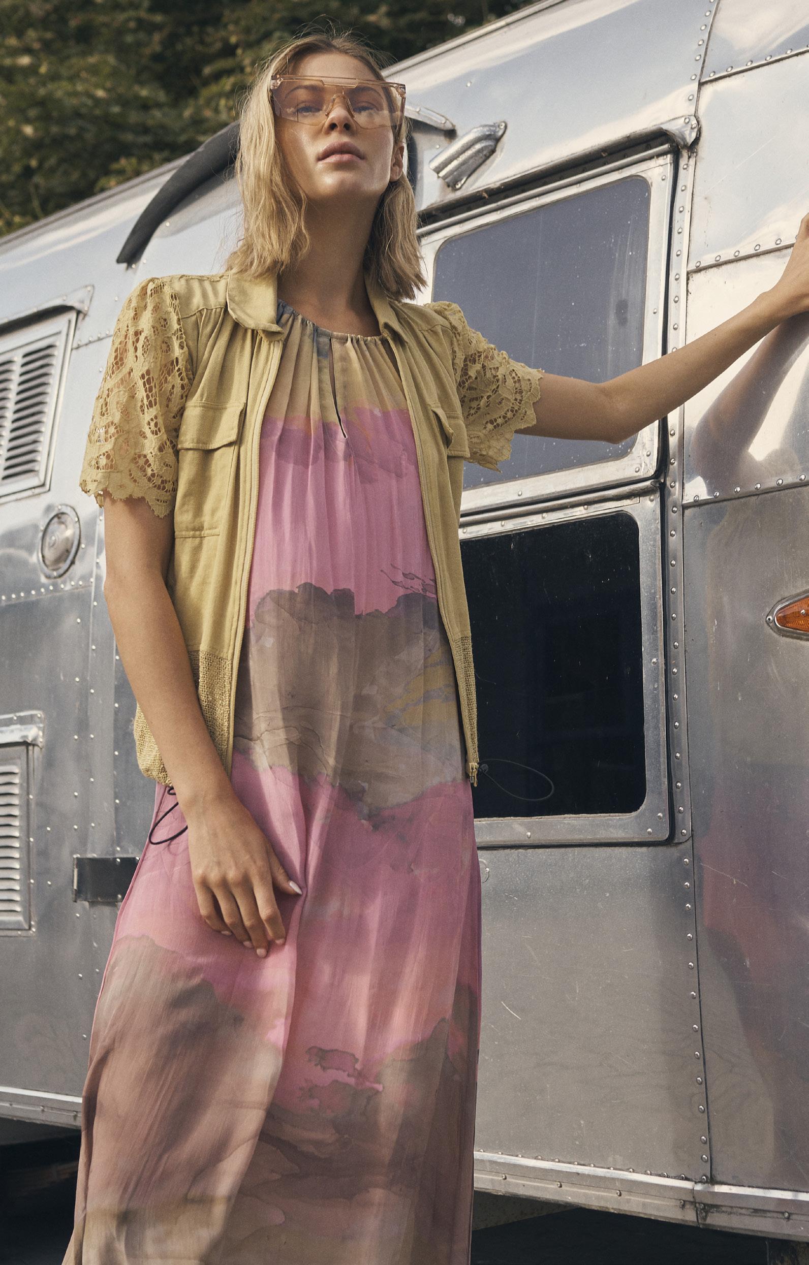 Think sunlit bone tailoring, shoreline sand linens, and buttery beige lace alongside flowing sunset blush silks, vibrant candy pink viscoses, and golden hour tie-dyes. Stripes and painted prints bring movement, while dusty rose florals and bold black-and-white graphics keep each look distinct. Whether in soft, draped shapes or sharp, modern cuts, every piece is designed to mix, match, and move with you – from coastal mornings to desert dusks, from spontaneous detours to destinations unknown. ENJOY