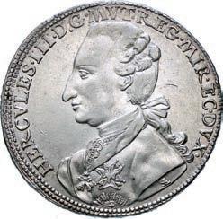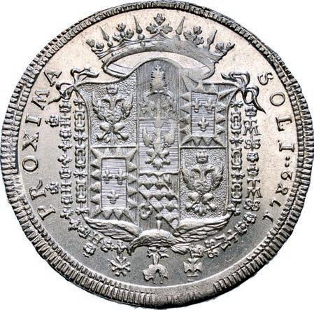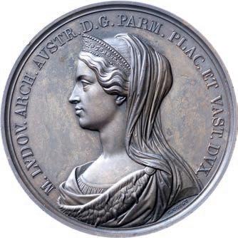 Esemplare in oro: D/ Due braccia, una femminile ed una maschile, uscenti da nubi, si stringono la mano. Dietro un arbusto di ulivo, simbolo di pace e fecondità R/ Sole raggiante e tre putti che stendono un drappo con l’iscrizione tedesca “come questi due sono diventati i nostri tre” g 13,92 mm 30 Au (fuso)