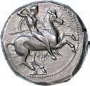 7 § CALABRIA Tarentum (288-281 a.C.) Nomos o Statere. serie campano-tarantina (alleanza monetaria con Neapolis) D/ Testa diademata della ninfa Satyra R/ Efebo a cavallo, regge una corona