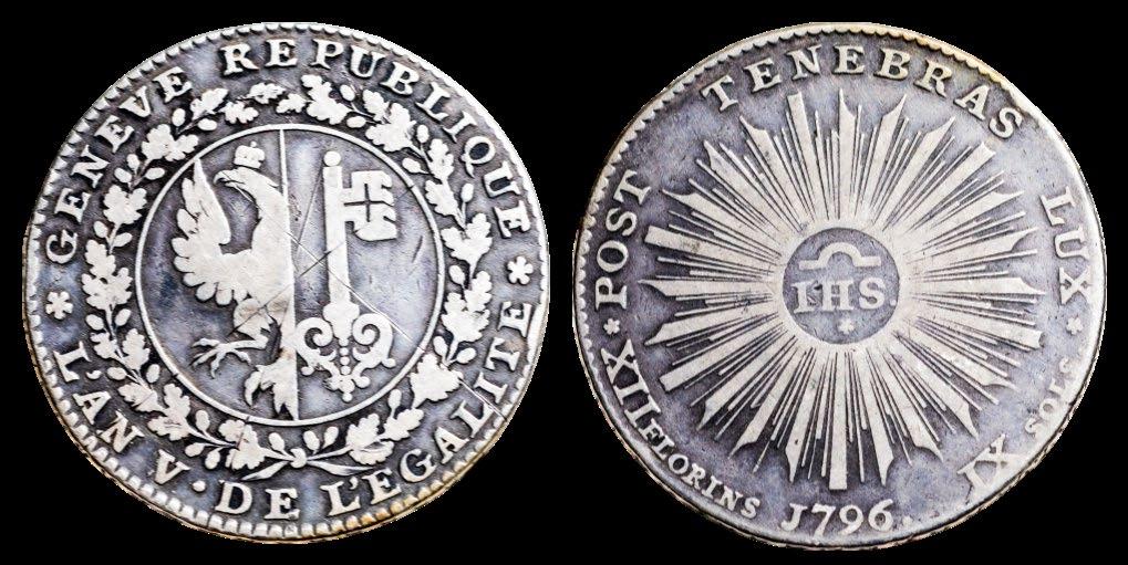 AR-Taler or Ecu de 12 Florins 9 Sols (39.9mm, 29.83g, 6h). Dated 1796. Obv. GENEVE REPUBLIQUE • L'AN V • DE LEGALITE, Coat-of-arms of Genève; wreath around. Rev. Rayed sun inscribed Ω/IHS/• in three lines. Divo & Tobler 1033; HMZ 2-339i; Dav. 1770; Demole 635.