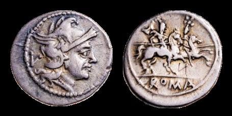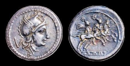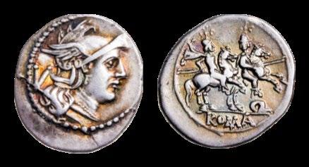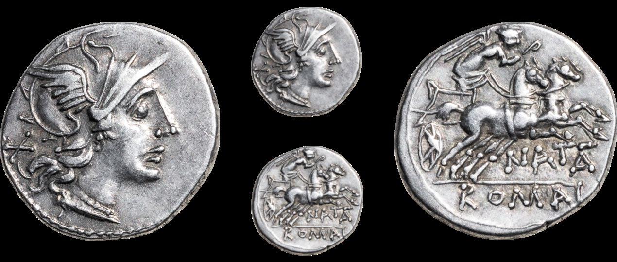 AR-Denarius (19 mm, 3.75 g, 3 h). 1st century BC. Obv. Head of Roma right, wearing pendant earring, necklace and helmet decorated with griffin crest; X behind. Rev. NATTA (TA ligate), Victory driving galloping biga right, whip in right hand, reins in left; ROMA in linear frame in exergue. This coin is imitating a Roman Republican denarius of Pinarius Natta (149 BC). See Cr. 208/1, Syd. 390 for for prototype.