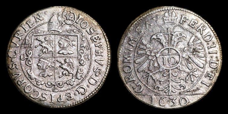 197 Switzerland, Graubünden, Chur Bistum, Joseph Mohr von Zernez (1627-1635) AR-10 Kreuzer (28.7mm, 4.52g, 12h). 1630. Obv. IOSEPHVS · D · G · EPISCOPVS · CVRIEN ·, Quartered arms, mitre and crosier above. Rev. FERD : II : DEI - G : ROM : IM : S : AV, Crowned double eagle, imperial orb with value 10 on its chest. 1630 in exergue. Divo/Tobler 1478a; HMZ 2-421d.