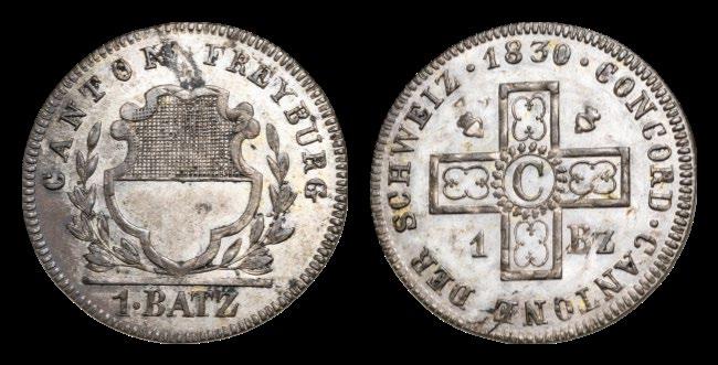BI-1 Batzen (24.7mm, 2.50g, 6h). 1830. Obv. CANTON FREYBURG Crowned arms between laurel branches, 1 · BATZ below. Rev. CONCORD · CANTONE DER SCHWEIZ · 1830 ·, Cross in quadrilobe, C in center. 1 BZ in the fields. Divo/Tobler 114; HMZ 2-286g.