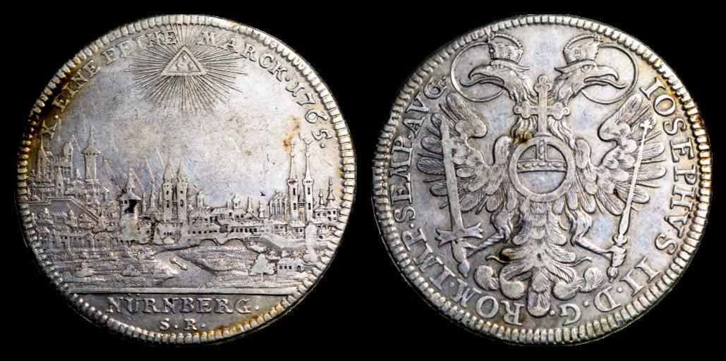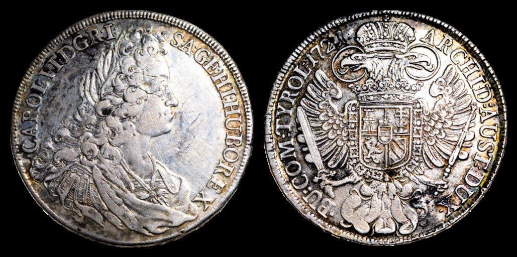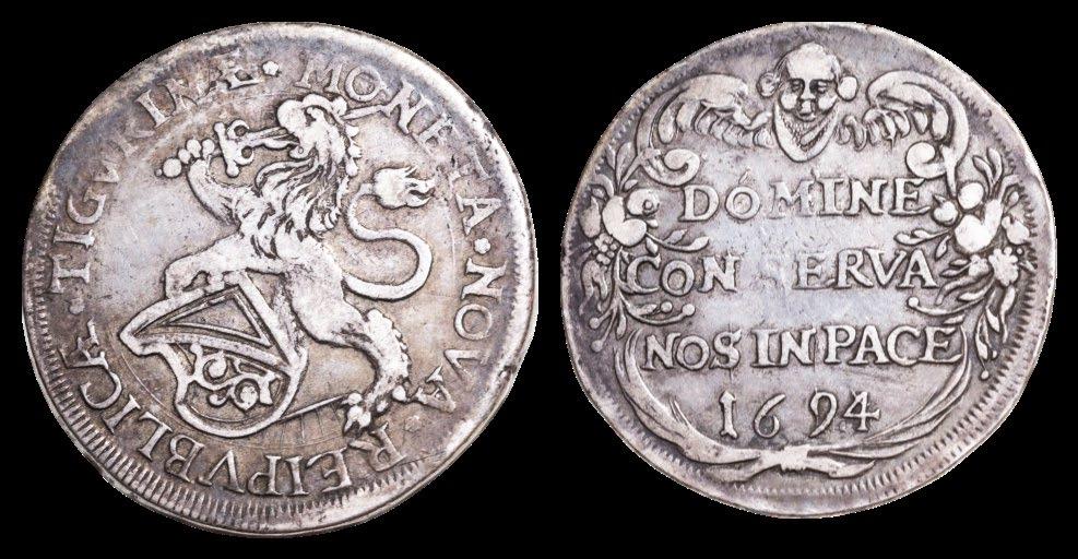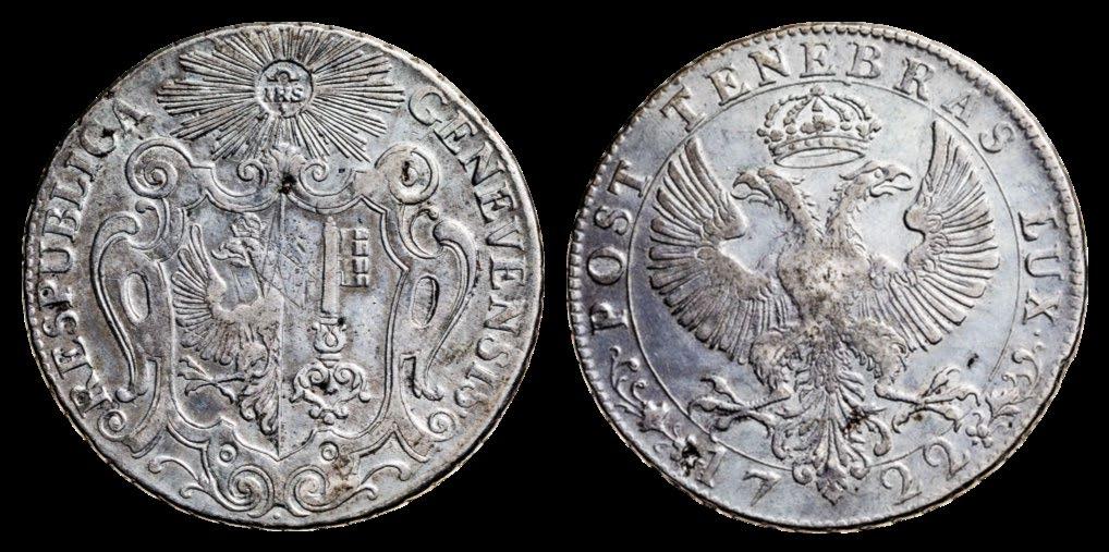 AR-Taler (39.6mm, 27.13g, 6h). Dated 1722. Obv. Coat-of-arms of Genève; above, rayed sun inscribed Ω/IHS in two lines. Rev. Double-headed eagle facing, with wings spread; crown above. Divo & Tobler 1007b; HMZ 2-339b; Dav. 1767; Demole 505.