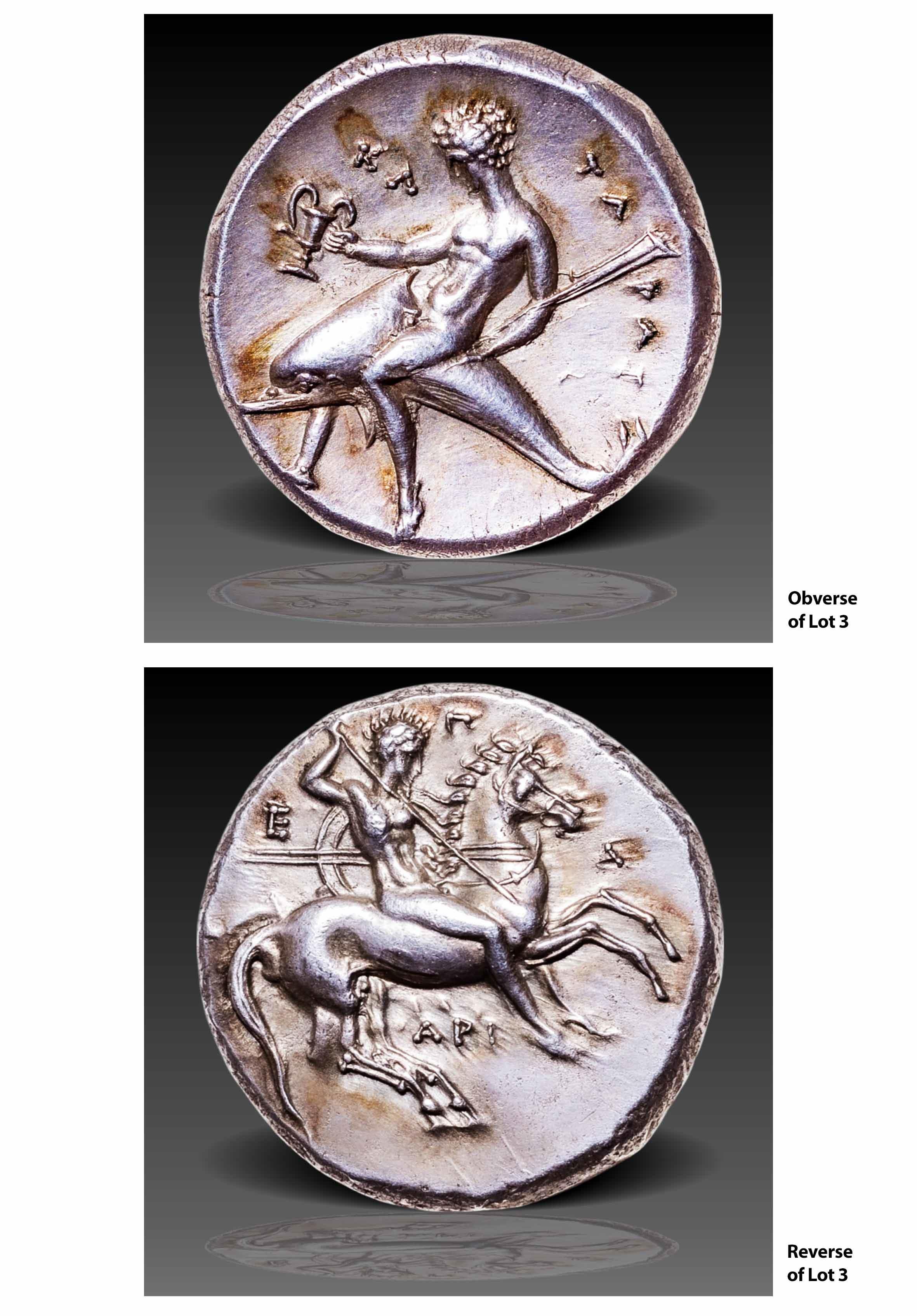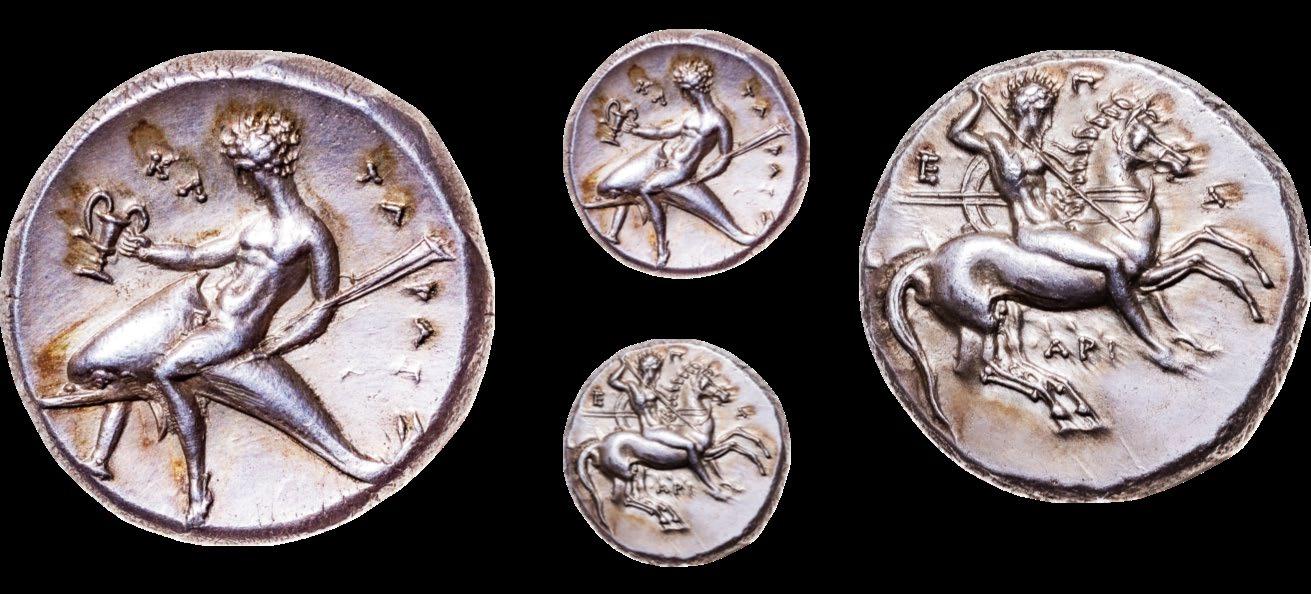 The cavalry of the Tarentines was renowned throughout the entire Greek World. The Tarentine aristocracy was especially proud of this reputation, which is clearly reflected on the coins of the Tarentines. The obverse of this piece shows a rider on horseback, elegantly practicing his fighting skills. The scene on the reverse is dedicated to the founding myth of the city of Tarentum. The identity of the rider of the dolphin is still being debated; one belief is that it could have been Taras, the son of Poseidon and the nymph Satyrion. According to legend, Taras was thrown into the sea during a shipwreck. His father then sent a dolphin to rescue him, and at the place where he came ashore, he founded the city of Tarentum, which is named after him. However, it could also have been Phalanthus, the leader of a group from Sparta. According to legend, Phalanthus also suffered a shipwreck and was brought ashore by a dolphin.