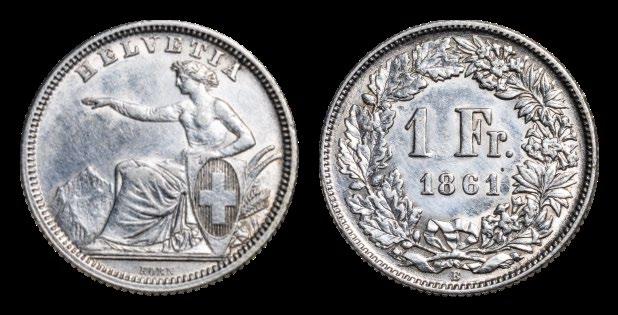 201 Switzerland, Schweizerische Eidgenossenschaft (Swiss Confederation) AR-1 Franken (23.3mm, 4.99g, 6h). 1861 B. Obv. HELVETIA, Helvetia seated to left in front of Alpine panorama, extending her right hand and placing her left on Swiss shield. Rev. 1 Fr. / 1861, all within oak and alpine rose wreath. Divo/Tobler 30; HMZ 2-1203e.