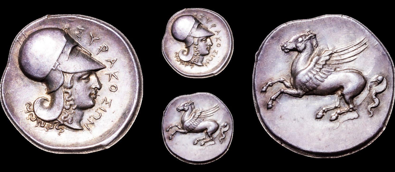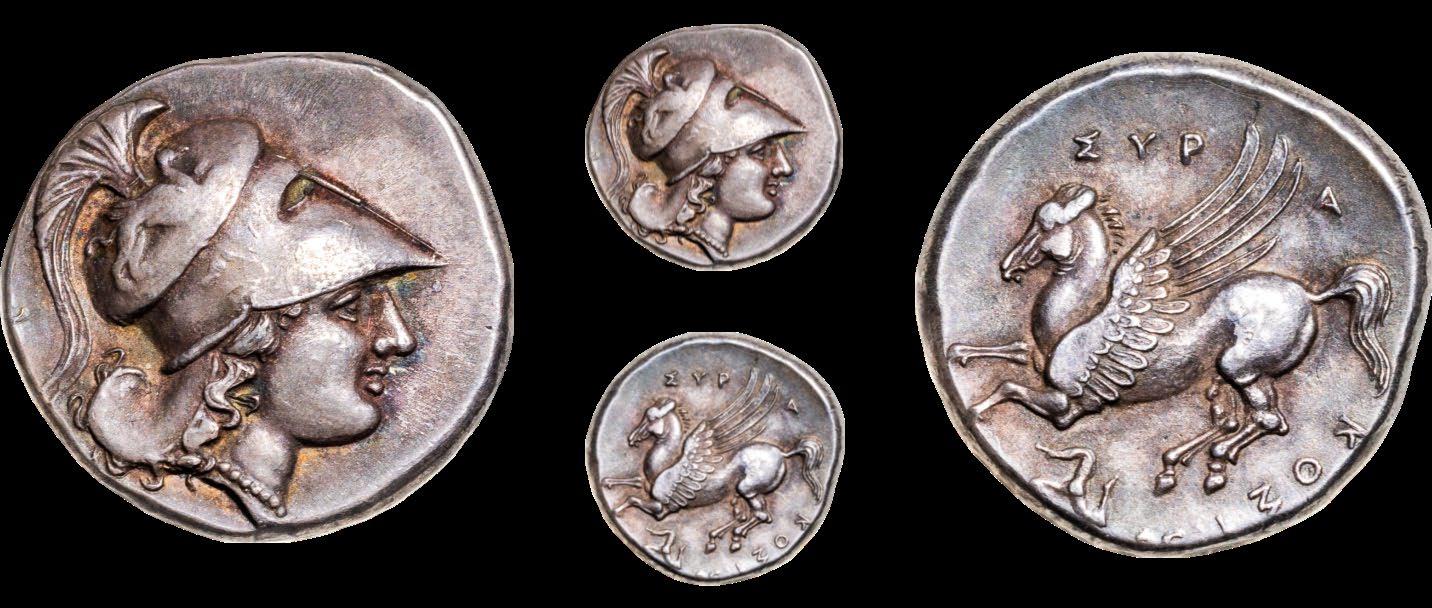 AR-Stater (25mm, 8.68g, 3h). Syracuse mint, struck circa 344-339/8 BC. Obv. Pegasos flying left. Rev. ΣYPAKOΣIΩN. Head of Athena right, wearing crested Corinthian helmet decorated with griffin on bowl. SNG Lloyd 1442; SNG Ashmolean 2032; SNG ANS 504; AMB 495; Pegasi 2; HGC 2, 1400.