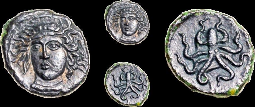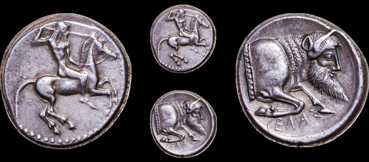 The protome of the man-headed bull charging to the right on the reverse is an artistic representation of the personification of the river Gela, at the mouth of which the city lay. The symbolism goes back to Achelous, the father of all river, whom was depicted in a similar way. The river gave the city its name and means “cold” in the language of the Siculi. Virgil and Ovid had already reported how particularly dangerous the river was, which is why it is depicted as stormy and brutal.