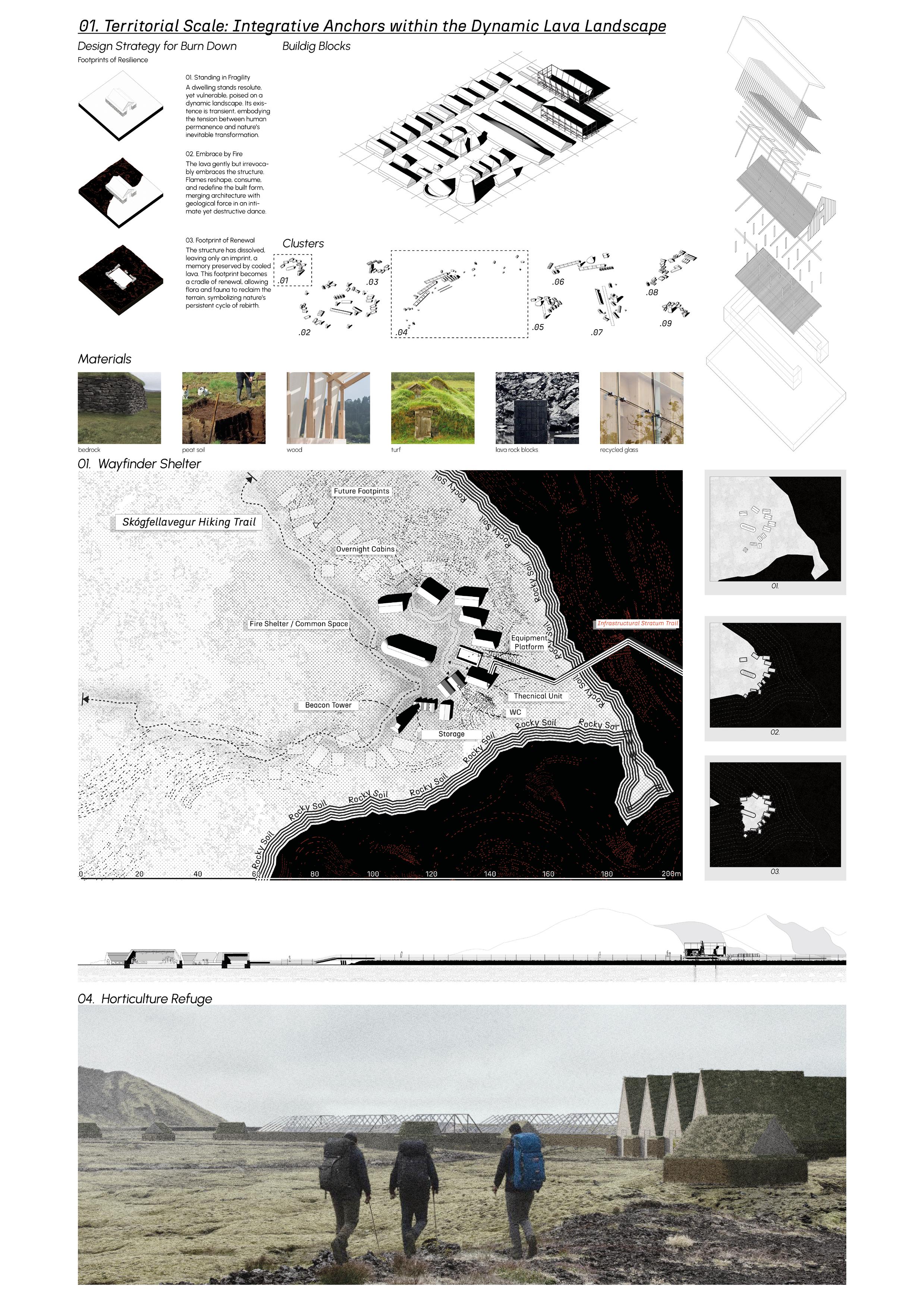 Inspired by the Icelandic turf house tradition, this panel presents architectural clusters that intervene lightly but meaningfully. Built collaboratively by communities, these structures offer both spatial refuge and ecological function. When lava arrives, they may burn, but what remains is a footprint, a shielded patch of flora, a mark of care. Situated strategically on brown and rocky soil, clusters like the wayfinding shelter and horticultural refuge enact a dual logic. They create inhabitable nodes while enabling future ecological regrowth. The architecture here is not permanent. It is purposeful, temporal, and memoried.