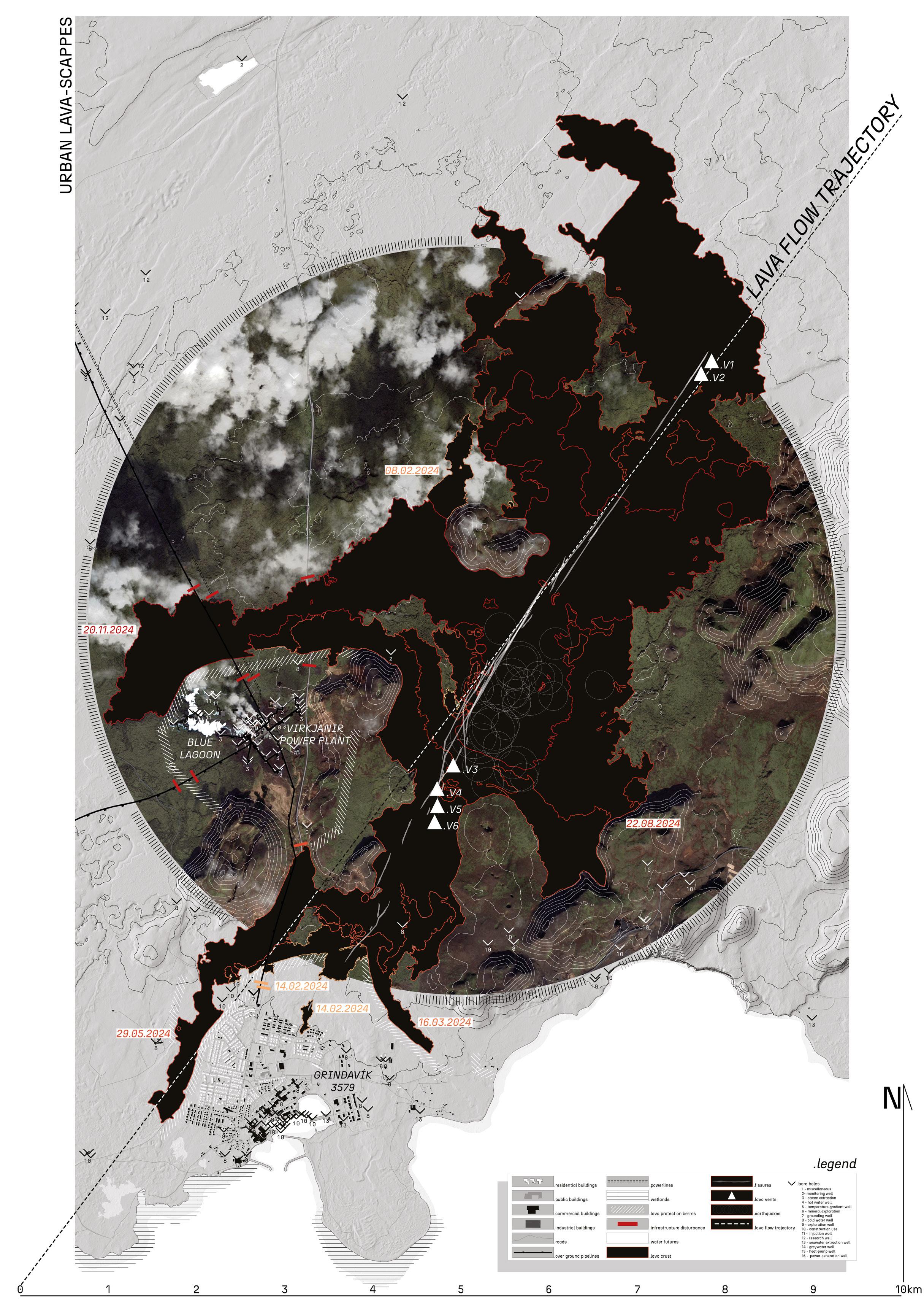 Here, the eruption’s trajectory is spatially unpacked, from the first vent openings and lava flows to the improvised defensive act of constructing a 30-meter-wide, 10-meter-high soil wall. The panel maps the cascading disruptions to flora, infrastructure, and the urban edge, including critical thresholds like the harbor and Blue Lagoon. What emerges is a reactive geography, a townscape shaped by urgency rather than design. The protective wall, though born from necessity, is re-read here not just as boundary but as a latent spatial typology reimagined.