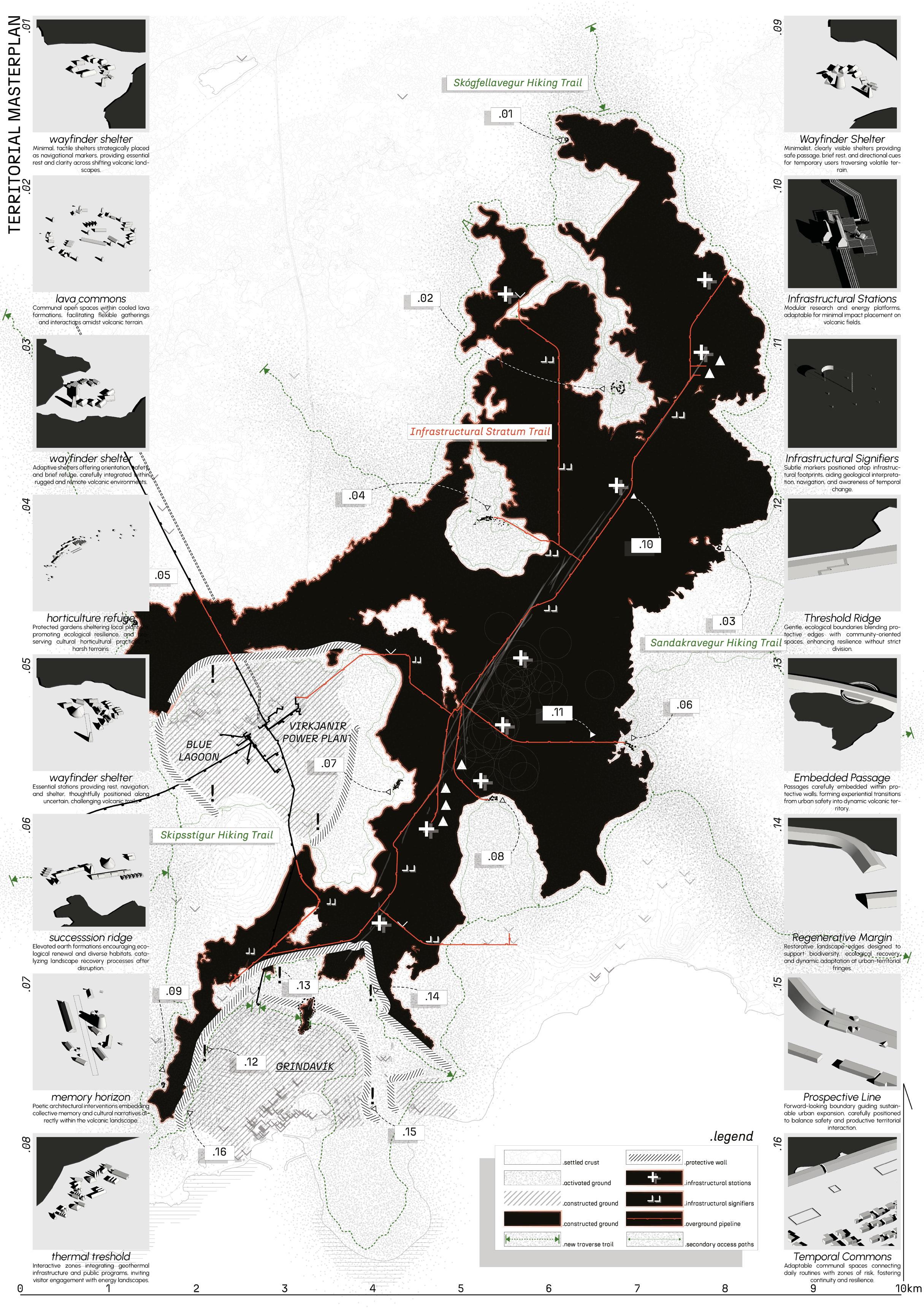The final panel integrates all interventions into a territorial strategy. The clusters, infrastructural lines, and local insertions form a dispersed but coherent network across the lava-impacted landscape. New hiking routes trace ecological gradients, infrastructural stations punctuate flows, and protective walls become hosts rather than boundaries. What emerges is not a masterplan in the traditional sense, but a choreography of resilience. Temporality, uncertainty, and locality are spatialized to enable future return, continuity, and coexistence.