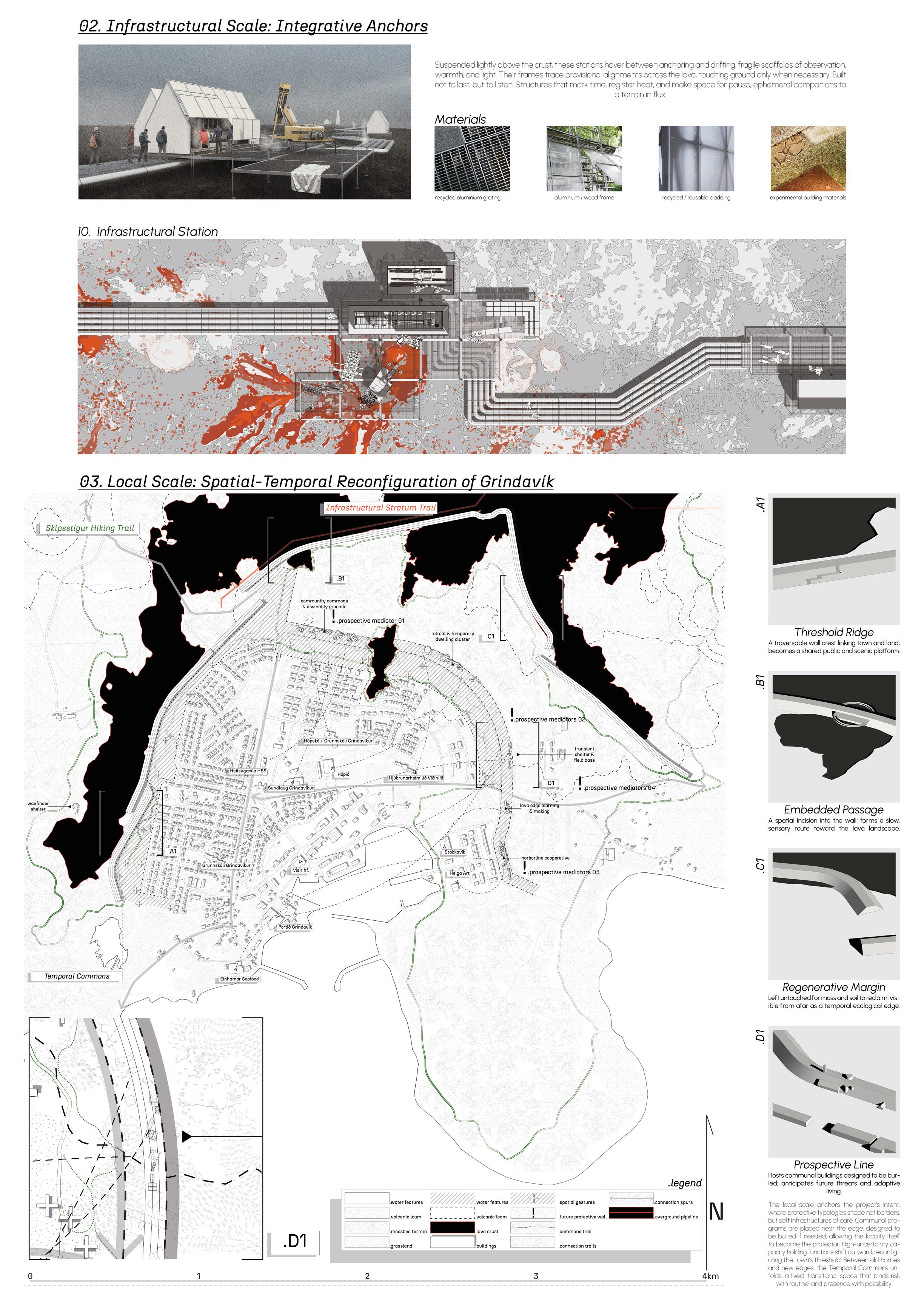 This panel articulates the infrastructural scale of intervention, introducing a light-touch network that hovers above the lava field with minimal environmental impact. Geothermal pipes, modular platforms, and recyclable structural systems form a connective tissue across the terrain. These platforms support energy extraction and research activities while leaving only trace anchors behind, future markers of geological, ecological, and human presence. The network extends into Grindavík itself, where the project transitions into the local scale. Here, the new edge condition formed by the protective wall is reimagined through a series of interventions. The temporal commons become a transitional urban void between residential life and the territory. The embedded passage cuts through the protective wall to host programs and reflection. The regenerative margin transforms soil into a substrate for dormant ecologies. Architecture is deployed not as object, but as passage, ritual, and infrastructural memory.