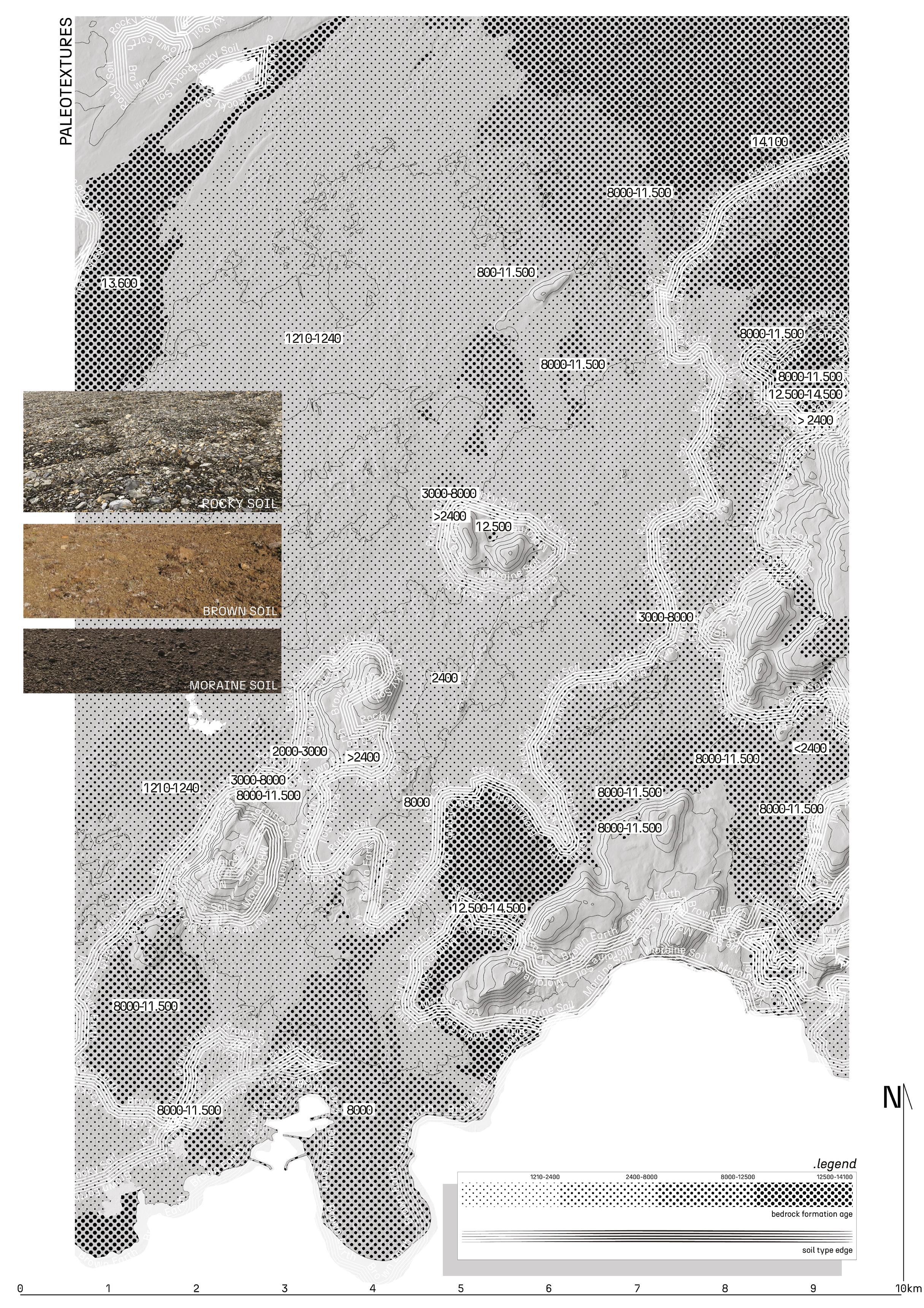 This panel delves into the soil types and bedrock formations that structure both the eruption’s impact and the ground’s capacity for recovery. Excavated soil for the protective wall is traced back to its geological source, moraine and brown soil, each carrying different ecological affordances. Elevated zones, often spared by lava, are revealed as potential sites for flora-fauna succession. The drawing does not merely map geology, it identifies the ground as a living archive, where past flows, material capacities, and future ecological strategies converge.