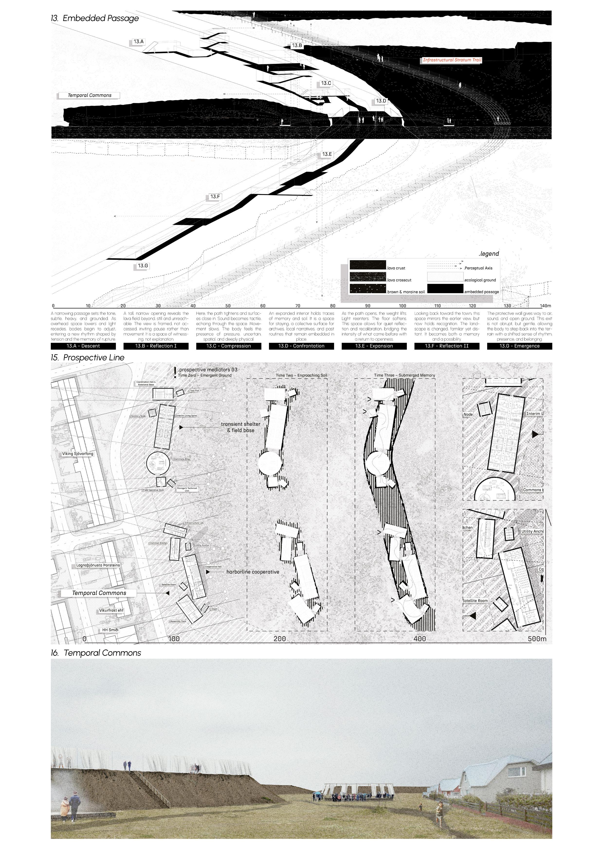 Zooming into the local scale, this panel focuses on two critical typologies situated along the protective wall. First, the embedded passage is a sequence of spatial experiences cut into the wall, hosting daily life, rituals, and collective reflection. From its elevated interior, views unfold toward the town and the dynamic lava field beyond. Second, the prospective line anchors the future of Grindavík’s outer edge, a planned zone for cooperative living and communal functions designed to be buried under soil in the next volcanic cycle. These programs, positioned to be both protected and protectors, are intended to be excavated and reactivated when reinhabitation becomes feasible. The accompanying image of the temporal commons captures the town’s new spatial threshold, a collective landscape of transition, pause, and possibility.