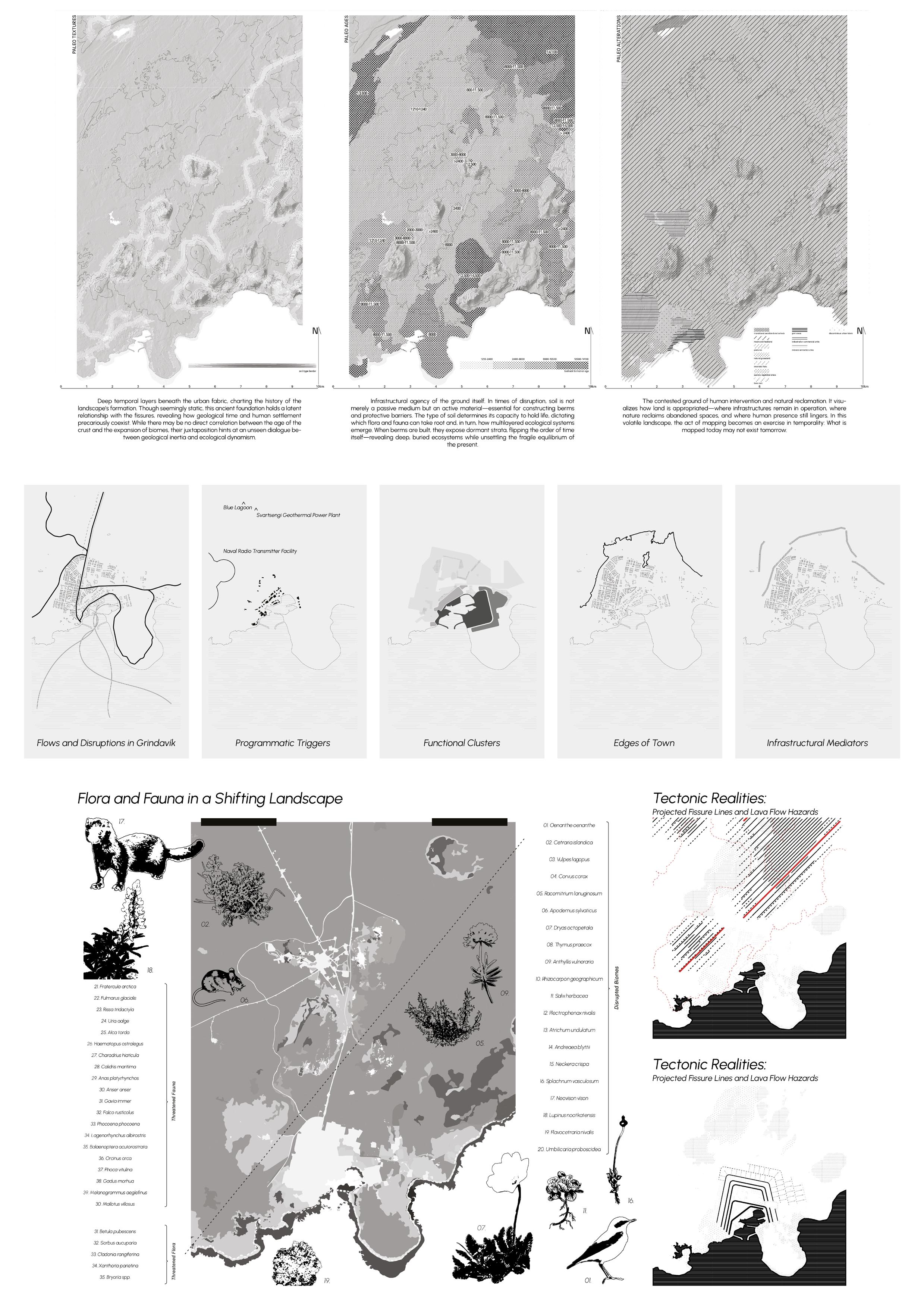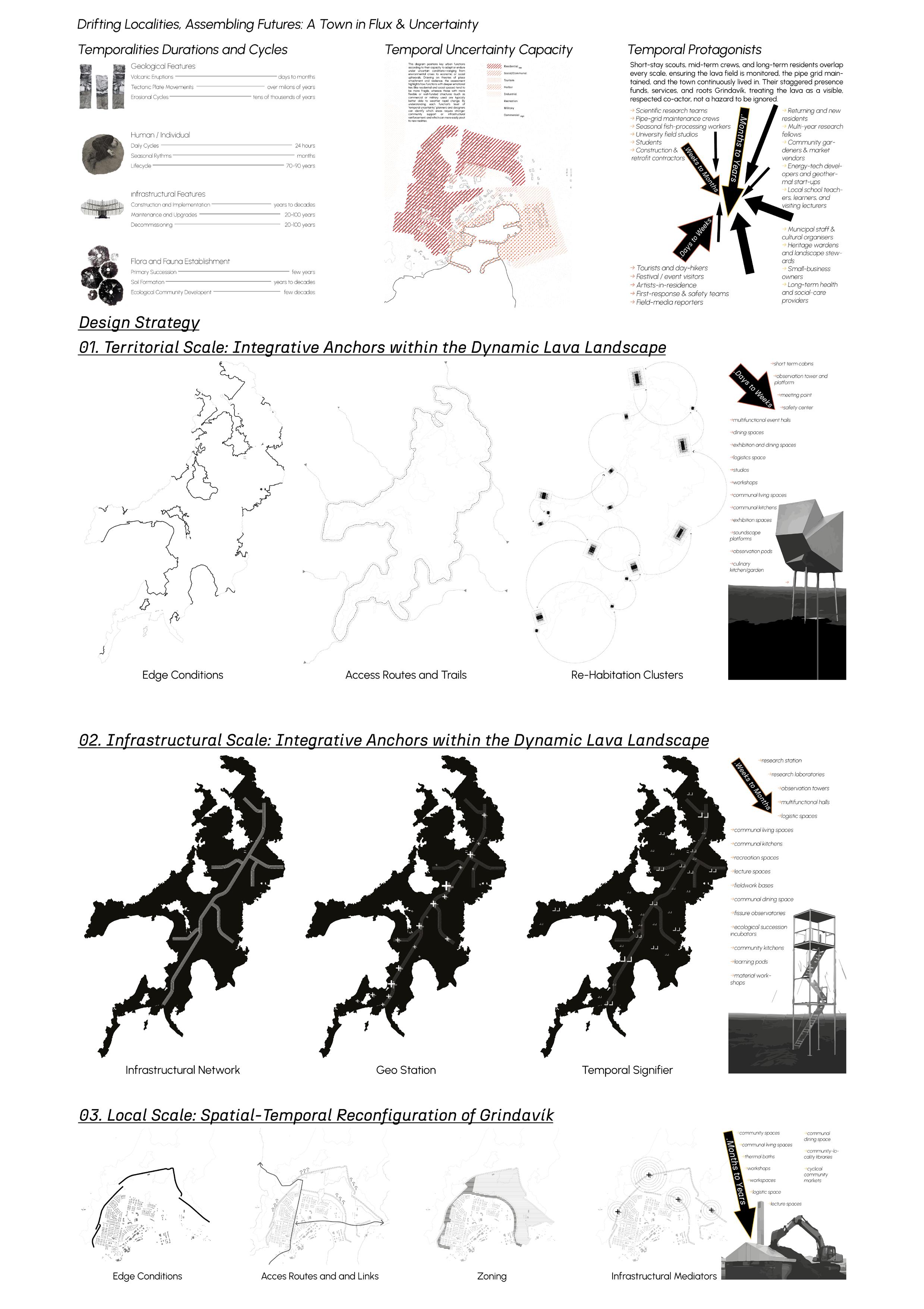 This panel introduces the project’s conceptual ground: the town of Grindavík, suspended between evacuation and return in the wake of tectonic disruption. It traces the emergence of a design agenda rooted in uncertainty, where architecture becomes a tool not for resolution, but for negotiation. The proposal unfolds across three spatial scales: territorial, infrastructural, and local, each activating a different temporal rhythm. At its core lies a recognition that coexisting temporalities are often revealed only in moments of crisis. The project seeks to embed locality, resilience, and care into a landscape marked by rupture, anchoring a future that is necessarily uncertain.