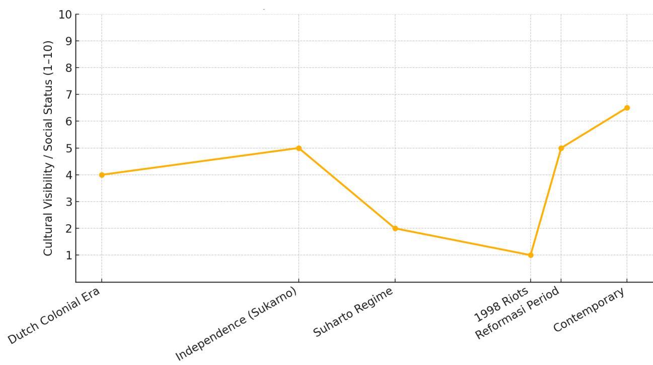 InIndonesia,however,Chinesecultureremainspoliticallysensitive,evenafterthe repealofassimilationistlawsPublicperceptionsofChineseidentityremain ambivalent,influencedbyhistoricalprejudicesandpoliticaltensions.Whileyounger generationsincreasinglyembracemulticulturalidentity,overtdisplaysofChinese heritageinpublicexhibitionsremainrare.Asaresult,curatorsmustadoptcareful strategies,suchasembeddingChineseculturalelementswithinbroaderhistorical narrativesorpositioningexhibitionsasprivate,community-ledeffortsratherthan publicheritageinitiatives(Suryadinata,2017).