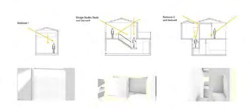 All bedrooms and toilets are located on the second level for privacy considerations. The large overhang provided by the roos is enough to make sure all these spaces which require low lux receive less than 300 lux based on the CS simulation readings. However, there is also a study room on the second level, which requires about 500 lux for reading and writing. In order to maximise the use of natural light, a skylight is strategically introduced to carefully bring in natural light and not radiation into the study room only.