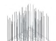 Primary study of the tangible relationship between each of the 19 unit’s roof with one another. Variables that were measured to test the thesis were the vertical displacement of the roofs, the pitched angles and the rotation of the roofs about their center. Iteration process was performed to optimize the results to favour the objectives which was “MAXIMUM SEPERATION AND MINIMUM INTERSECTION”. The resultant optimized result was partitioned to specifically analysied the form generated from the data and a cluster of 9 roofs were selected. A single vertice was analysed from within each of the 9 units to generate all possible forms of volumetric wave profiles which gives rise to a spectrum of possibililities. The model illustrates the volumetric boundary of all sorts of wave profiles that can exist from the formation of the vertices in the geometry. The darker lines illustrate the 3-Dimensional displacement of the 9 particular vertices and the lighter lines shows the volumetric boundaries of any points or limits of the shape of the wave profiles generated.