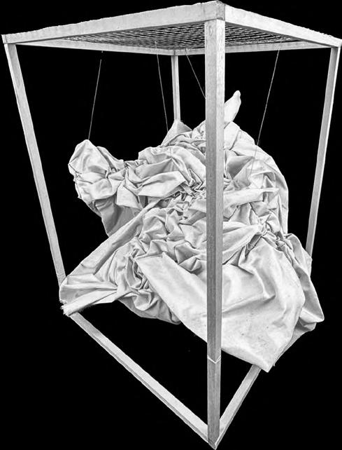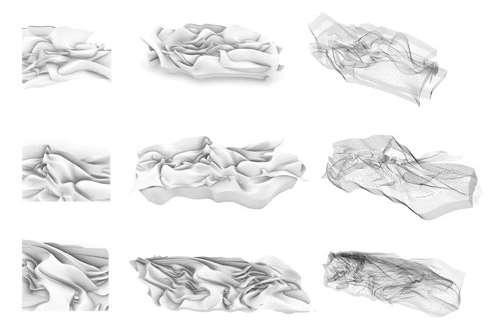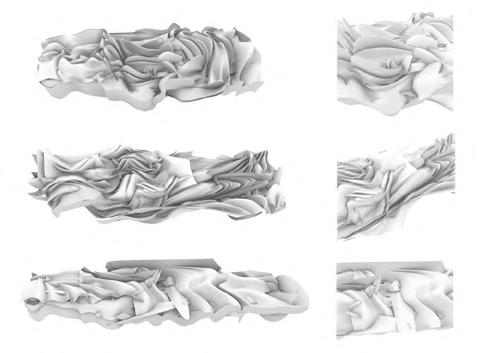 The musical notation is used to highlight the different parts of the song;the chord progressions are shown thtrough the bar ripples and the merge during the transitional phase between chords, the small checkered shadings shows the piano melodies and the converging lines corresponds to the guitar and ukelele strings. Each of the resultant moments were coded digitally to show the variations in the intensities of the songs as different moments come together and create a it’s own musical language. The resultant amalgamated moiments are represented as warped surfaces on the code. These information are then translated onto grasshopper to set parameters in order to optimised the instructions that will be transcribed onto the fabric. This includes controlling the number of folds, pleats and ruffles and the amplitude of the folds on rhino & grasshopper using a set of code. These optimsed formed are then inscribed and sewn on the surface of fabric to understand how it might create different spatial qualities and how it will appear as a structure when it is scaled. The soft fabric is hung from the grided surface that corresponds to the warped surfaces on the code as the hotspots emerge at specific instances. Optimised parameters for fabric manipulation