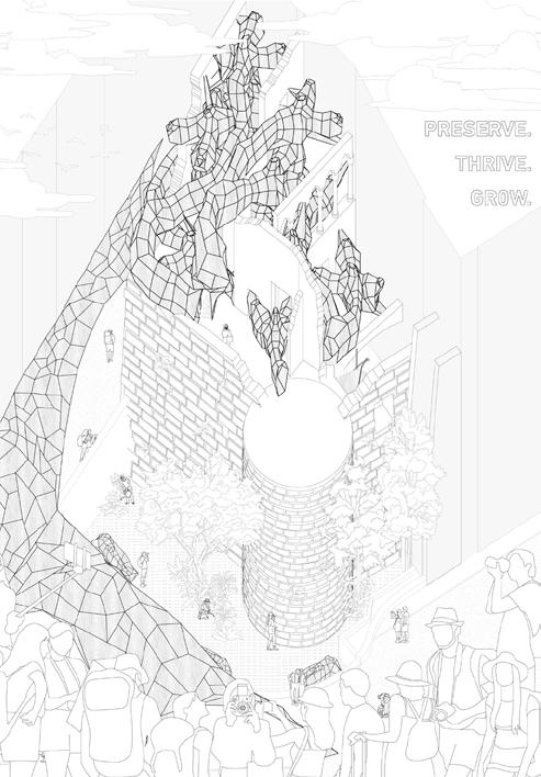 This project takes inspiration from the hydration and solidification of concrete to propose a new approach towards heritage design and a-monumental architecture through the re-Hydration of the existing ‘dried’ monument and landscapes. Domains surrounding the site were considered and re-connected, bonding itself to the existing monument.