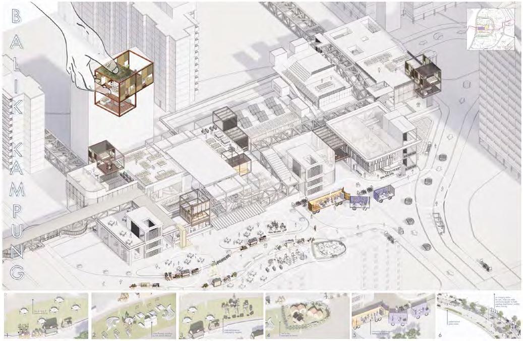 Shown here is the revitalisation of abandoned warehouses into a market and hawker centre. The large distance separating the two rows of warehouses are converted into an urban belt that sections the space into different complementary public spaces. The local families can enjoy the convenience of a local public space that can accomodate each family members different activities.