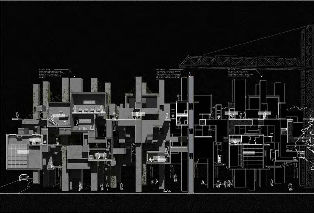 by the chaotic accumulation of inspirational junk in our studios – from model-making materials to digital devices and equipment, to drawing print-outs. As such, my project involves designing an architecture school as a critique of our education that induces hoarding behaviours in students. At the same time, it celebrates this social-cultural disorder on site.