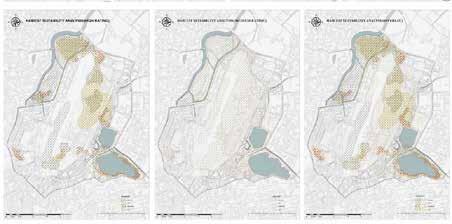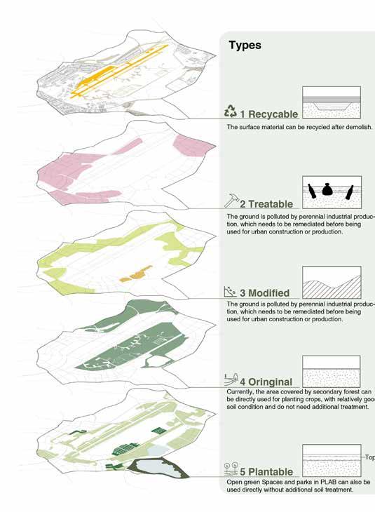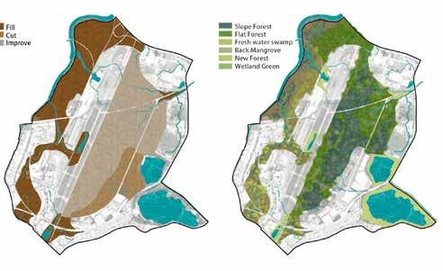 PLAB is situated in the eastern catchment of Singapore; its waterways flow into multiple catchments - Serangoon and Bedok Reservoirs, or into the open sea. The topography hosts a wide range of levels, with terrain elevations varying from 0.0m to 50.0m. The surface rainwater flows along the uneven terrain, forming temporary streams and ponding areas during heavy rain events. It contains over 80ha of runway and 00hc of industrial buildings consisting of a large amount of asphalt and concrete that are recyclable; various types of soils from healthy soils with organic debris accumulating over several decades to inorganic soil at Tampines HDB stockpiles. Despite the dominant urban layout, the existing topography and many large trees that are naturally grown offer a unique opportunity to create new landscapes or can be recycled while minimising carbon footprint and transportation cost to the landfill site and regenerating the history of post-modern industrial landscapes.