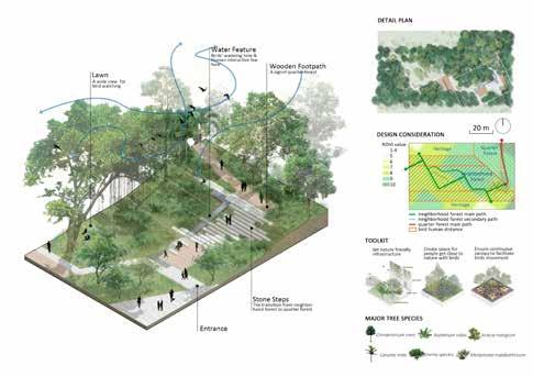 Under the guidance of the development and issues in Singapore, the studio enables me to re-examine the relationship between nature and nature, as well as between human and nature, so that they can connect with each other and mutually benefit each other. The research and design started from large-scale planning of PLAB and then focused on quarter scale to neighborhood scale areas.We integrated ecological knowledge with landscape architecture to promote forest regeneration and improve people's mental health with the help of birds.This is a new challenge for us to seek the solution of how to provide a more conducive environment for birds while respecting their habits, and at the same time maintaining a reasonable relationship between human and nature.This new experience is the cornerstone of our study to figure out how can our design serve as a balance between human and nature to bring benefits to our living environment.
