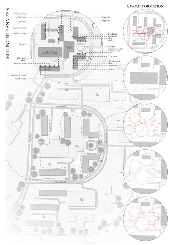 The choice of site is the existing Mei Ling Market and Food Center first built in 1969 and renovated in 2009. Perched on top of a slope, it is flanked by old HDB slab blocks and connected directly to a Multi Storey Carpark (MSCP).