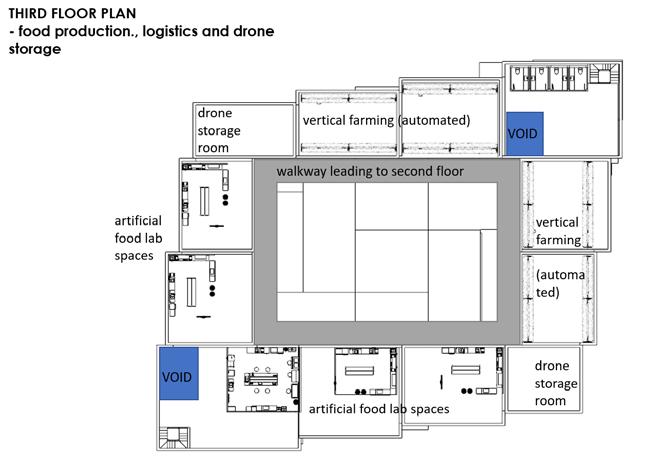 The building is divided into three distinct segments: a workspace, a food collection area, and a family dining area. The design allows for a clear separation of the programs while also allowing for fluid movement between the different areas. The workspace segment is intended to provide a dedicated area for work-related activities, while the food collection area is meant to facilitate easy access to food. The family dining area is designed to be a comfortable and inviting space for families to spend quality time together, with a focus on promoting bonding and social interaction.
