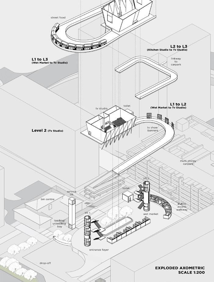 Two main walls are placed to separate the main circulation space and the programme spaces, where vertically overlapped programmes are placed at the sides with the circulation in the middle. Programmes then spill into the central area to increase sensory interactions; sound that travels upwards, food smell from hawker stalls to circulate and visually connected on different levels. Additional programmes such as cooking workshop, barbecue pits, community kitchen and edible garden align with attracting different groups of users to bond over food.