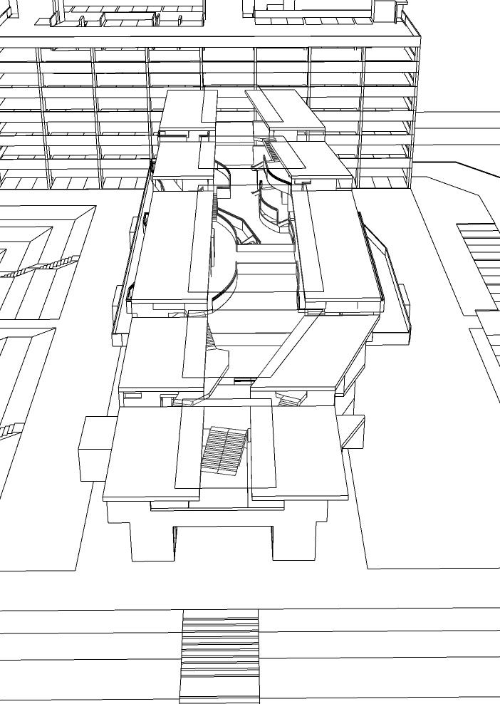 Navigating spaces with illuminance. To tackle the ongoing issue ageism in hawker communities in Singapore, this project premises around the spatial concept of bridging. Through the aid of studies to perceptual navigating, the design and program of the building comes through in the form of tangible and intangible connections using physical things and light. Our brains generally help us in using a guiding process of sensory information. This sensory information are how we identify objects using existing knowledge. So far perceptual navigation, it includes tangible things and intangible things. Tangible things are like staircases, shelters, and covered areas while intangible things would include things like light and sounds and things that your 5 senses bring you to. In a dark space, people are likely to walk towards a space with light because our senses are comfortable being aware of it. So light becomes an intangible element that allows us to travel through a void because it’s what we perceive. Through the idea of perceptual navigation, the form of the building is derived from the “current path“ within the site, using light as the navigating element.