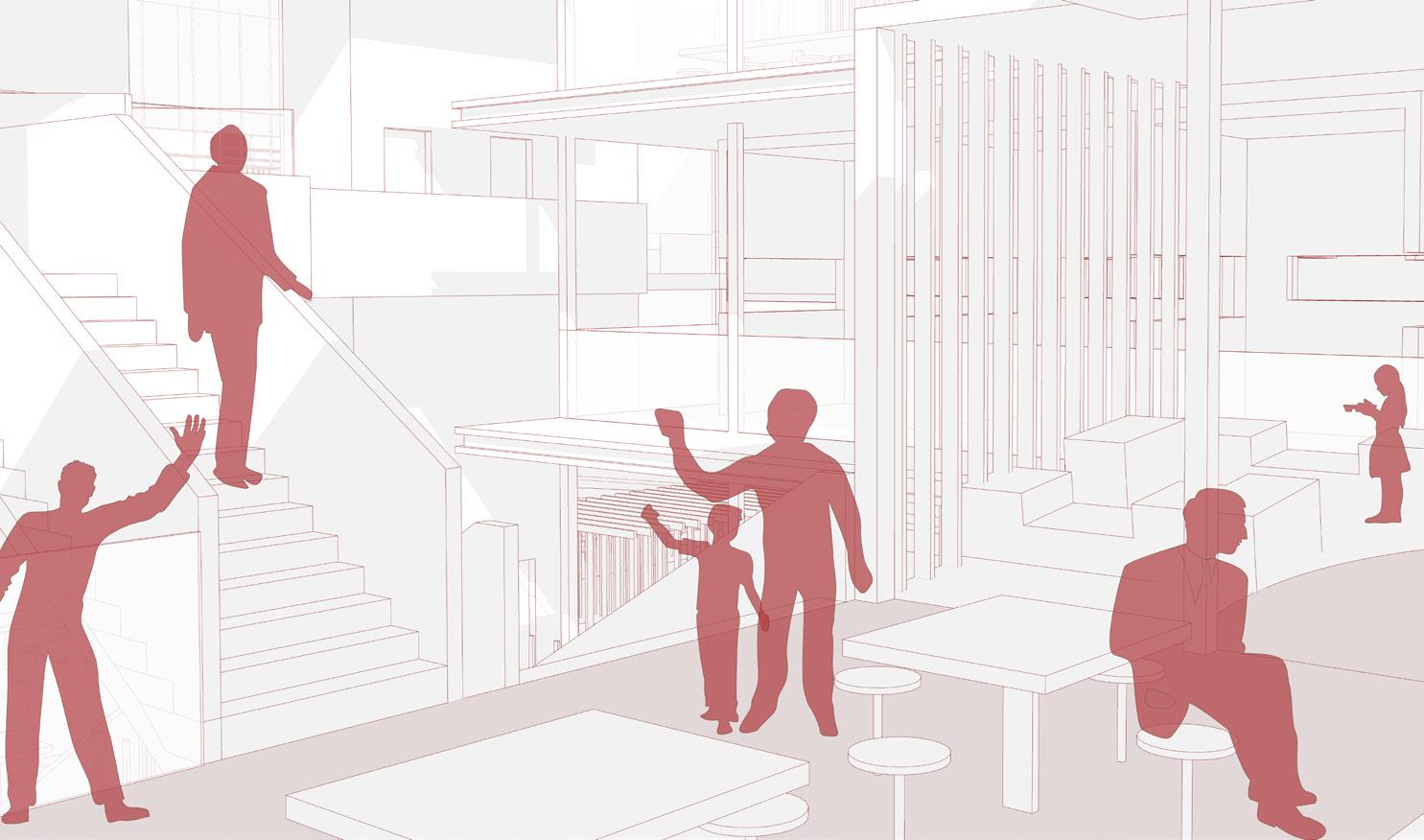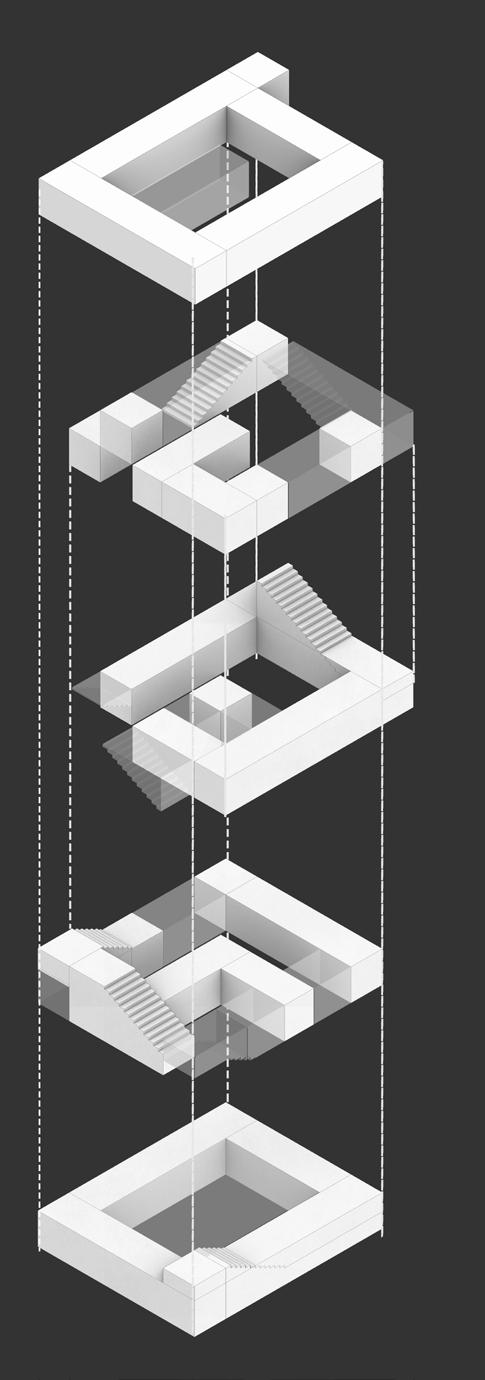 One such use of the areas include vertical circulation. The areas of the lower floors are projected upwards to include vertical connectivity. Different spaces on other floors can then be weaved into the main programme spaces entirely.