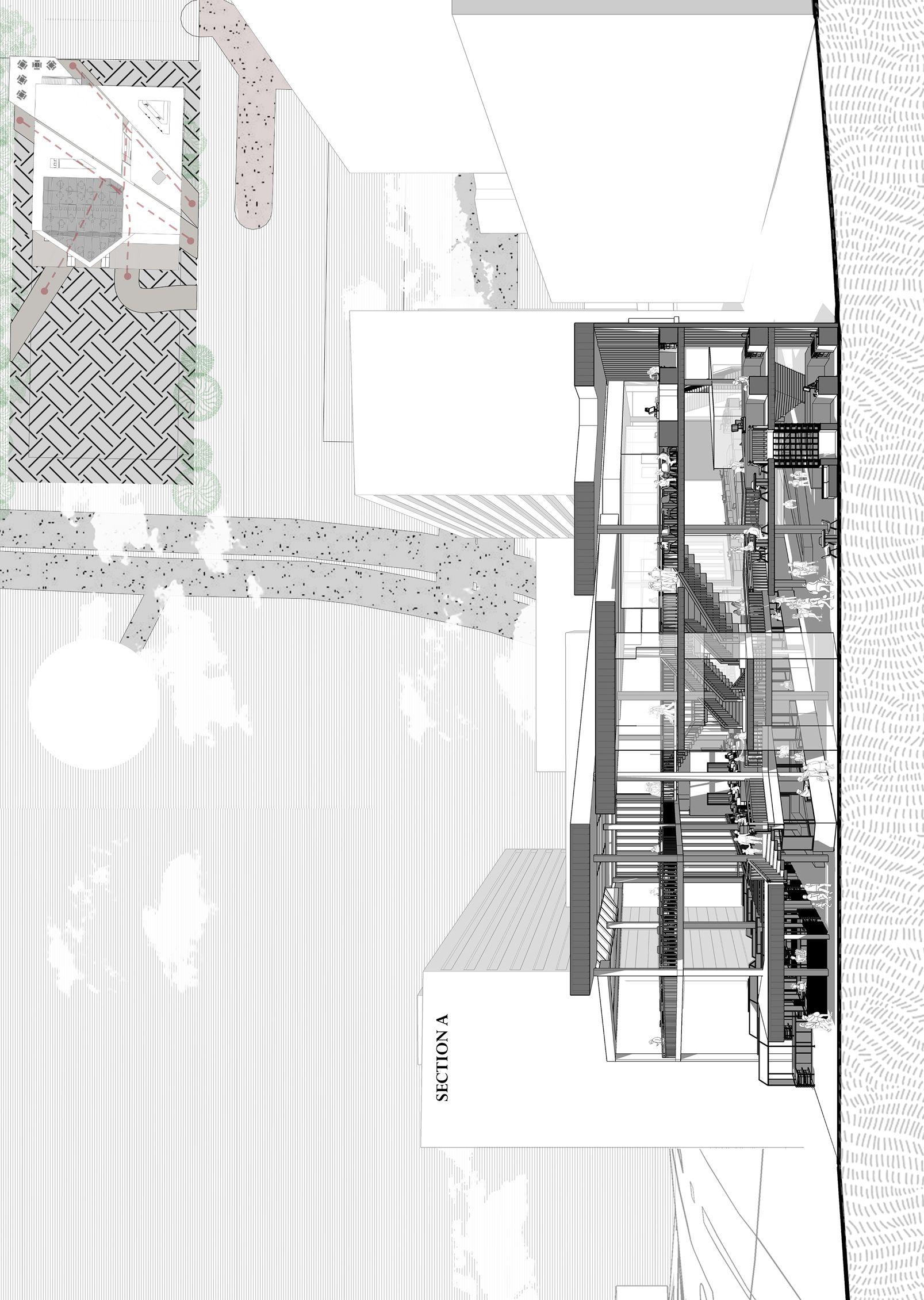 The Raumplan Market is a place where everybody gets together while having pockets of individual space. It tackles the loneliness the aging population will inevitably feel, through the use of double volume spaces that is commonly found in courtyards, arranged through a helicodial movement to create diagonal connections while the apertures of the walls serve the horizontal and vertical connections. The diagonal connections and apertures are used to foster different interactions between the stakeholders.