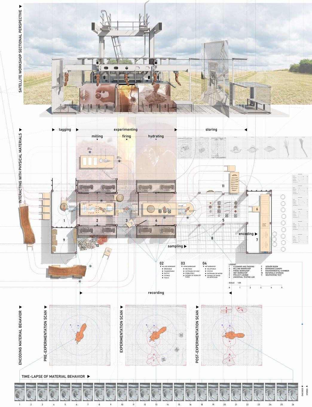 The design project therefore proposes a new type of architectural practice which aims to increase material literacy for the new Digital Master Builder through physical material experimentations that are encoded to build a digital material inventory. Through encoding material behaviour derived from physical materials into digital geometries, it restructures an understanding of materials to perform consistently between both the digital and physical domains. Digital geometries encoded with existing material properties will recentre a more empathetic perception of material behaviour and reduce resource intensity in construction practices. Anonymous materials encoded with non-existent material properties will clearly identify areas that require innovation intervention from material and structural engineers, without relegating the liability of unrealistic designs to manufacturers and contractors. By synchronising material behaviour into the digital environment, digital geometries can no longer be perceived as dull matter, but one that embodies its own behaviours and affordance, responsive to the splicing and stretching by the architect.