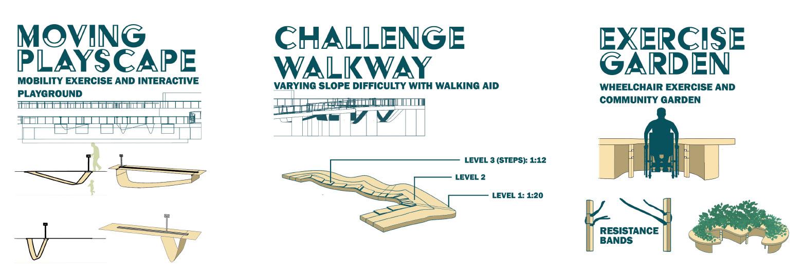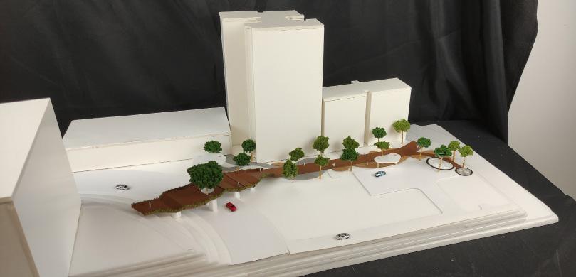 This physical model highlights the overhead bridge ramp across Mei Ling Street and the 3 zones - Garden, Fitness & Play. It also encompasses resting areas, a Pavilion area, a sheltered vehicle drop-off point as well as trees planted around this proposed route walkway