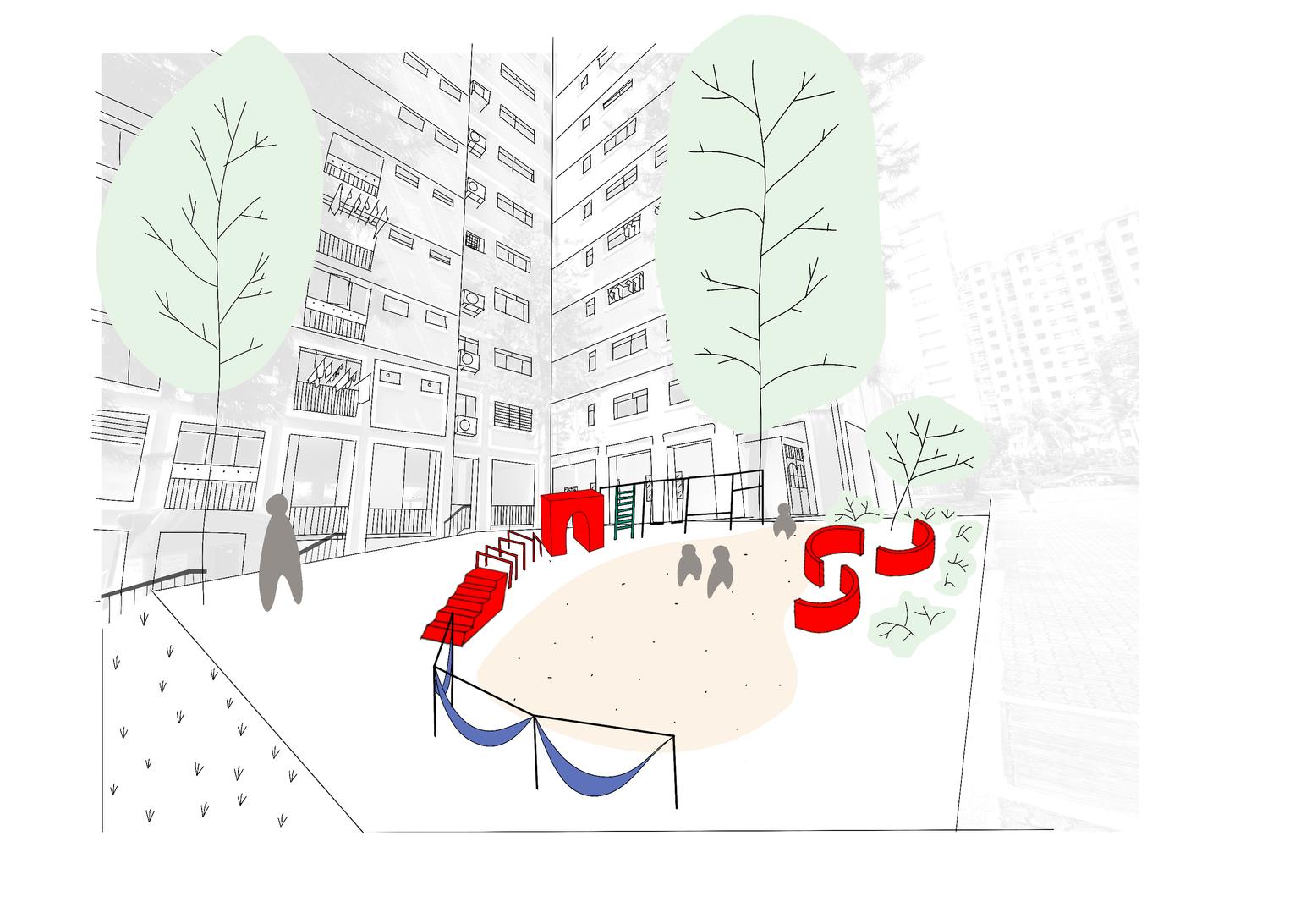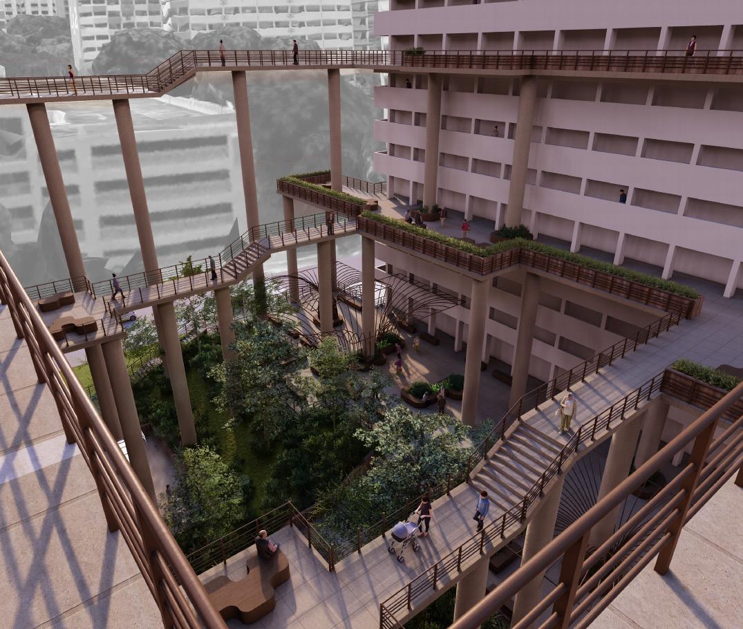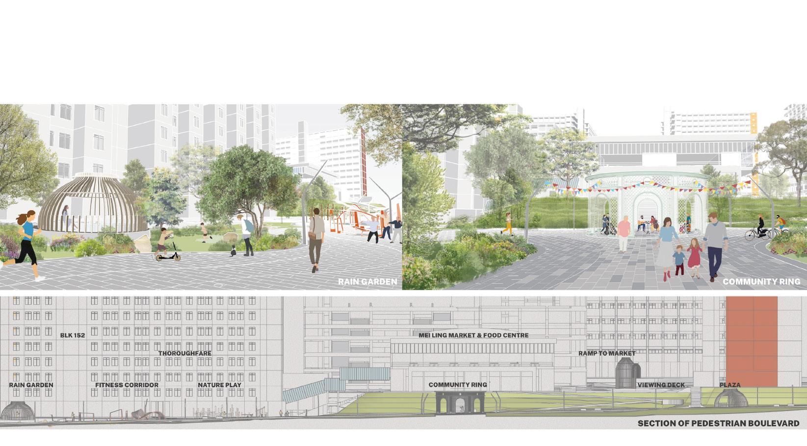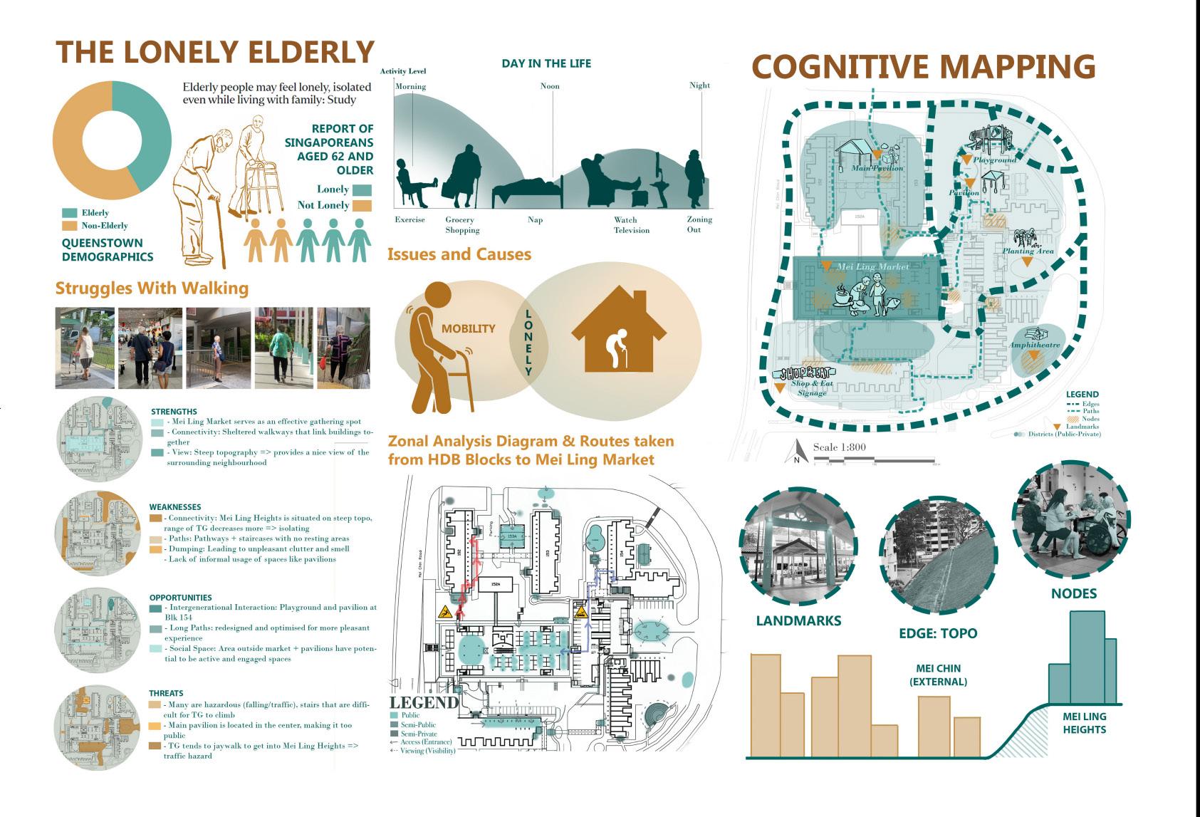 The aim is to make Mei Ling heights a golden haven that encourages the going and staying outdoors to eliminate loneliness. The main concept are exposure, opportunity and retrofitting, giving rise to strategies to improve connectivity, create programmes and allow for multi-usage of space.