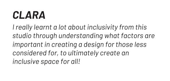 Listening to the stories, insights and feedback from the community gave the students new definition and purpose; and they rose to the challenge by seeking to design tailor-made solutions which were targeted, and yet could still be inclusive to all. This document celebrates their efforts throughout the semester, and may the lessons, feelings and determination learnt together carry through school and their career as designers.
