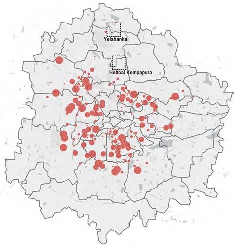 This studio project used the context of Bangalore, one of the most rapidly urbanizing cities in India [1]. Greater Bangalore is the administrative, cultural, commercial, industrial, and knowledge capital of the state of Karnataka with an area of 741sq. km. The city administrative jurisdiction was redefined in 2006 by merging the existing area of Bangalore city with 8 neighbouring Urban Local Bodies (ULBs) and 111 Villages of Bangalore Urban District. It is currently the fifth largest metropolis in India with a population of about 7 million. Population density has increased from 10,732 (2001) to 13,392 (2011) persons per sq. km. The per capita GDP of Bangalore is approximately $2,066 USD. Hebbal Kempapura, in north Bangalore is selected for this studio, representing an unplanned formal settlement with a culturally diverse and vibrant population experiencing environmental degradation and loss of vital ecosystem services.