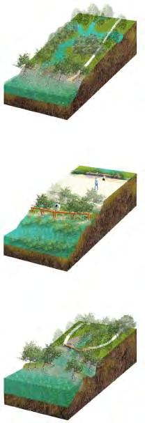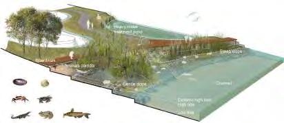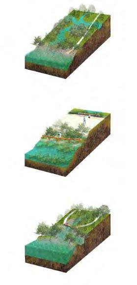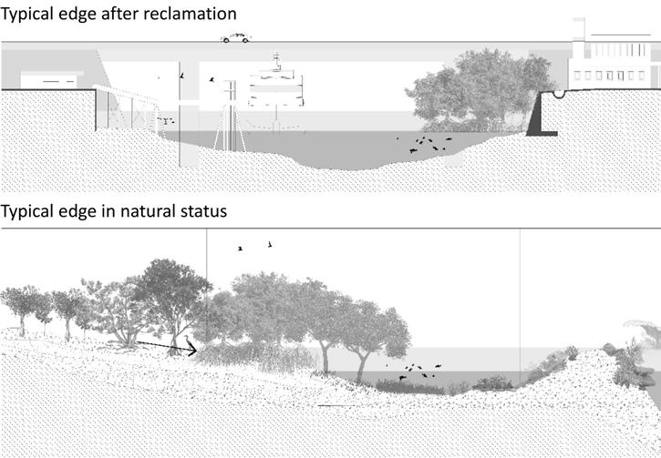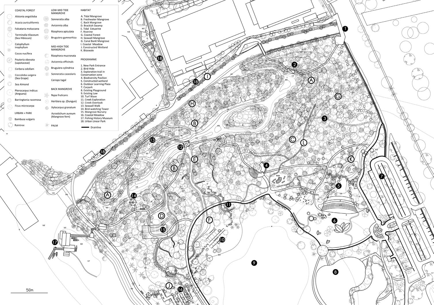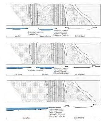 The project applies three strategies to reshaping the coastal edge landscape. Firstly, to diversify landform and shoreline, a shallow branch of water is introduced into the site where both shoreline and waterfront are redefined into natural forms. This creates a heterogeneous hydro condition such as brackish pond and riverine estuaries which expands the intertidal zones.