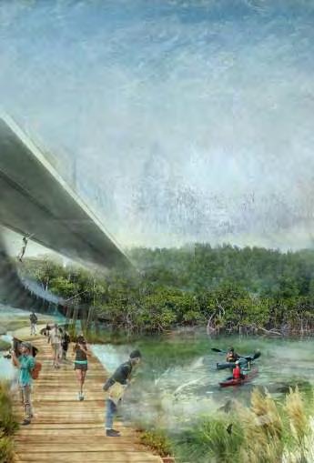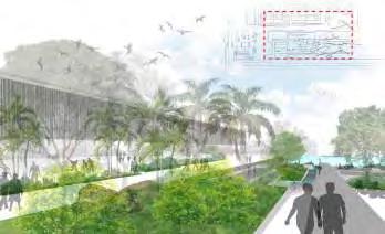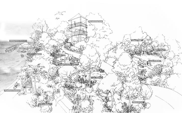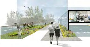 Lastly, the project integrates development into coastal habitats with both education and recreation activities that are arranged closely with nature based on habitats distribution. Community activities happen mostly in the northern part of the site, while housing and passive recreations are placed in the southern part. Mangrove restoration project is mainly placed on the new island. Jogging and biking tracks connect the whole site and implementation of boardwalks, treetop walk and aerie tower allow people to go through these coastal habitats.