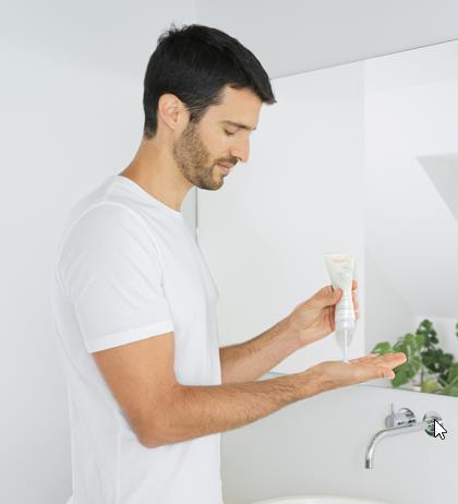 1- Umezește-ți fața 2 - Aplică produsul (o cantitate de mărimea unei migdale) în mână (NU pe capul de silicon)